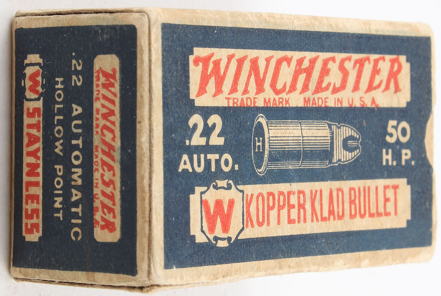 Winchester, Kopper Klad Bullet, .22 Automatic Hollow Point, RHWeb: WRA-12.5 WA-2Bc, Full, 1pc. Blue white & red box, box is solid with very good color, minor age soiling, partial seam split to top front edge, minor edge & corner wear, end flaps are solid, ammo is very good. Grade: Very Good + - Value: 80 to 120