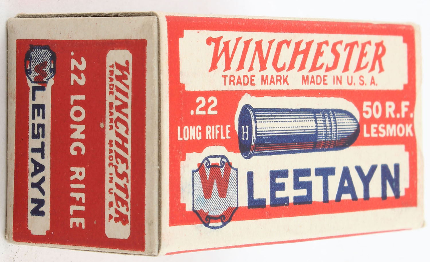 Winchester, Lestayn, .22 Long Rifle, RHWeb: WRA-13.5 LR-1a, Full, 1pc. Red white & blue box, box is MINT with minty color, corners are sharp, edges are crisp, end flaps are solid, ammo is good to very good. Grade: MINT - Value: 150 to 225