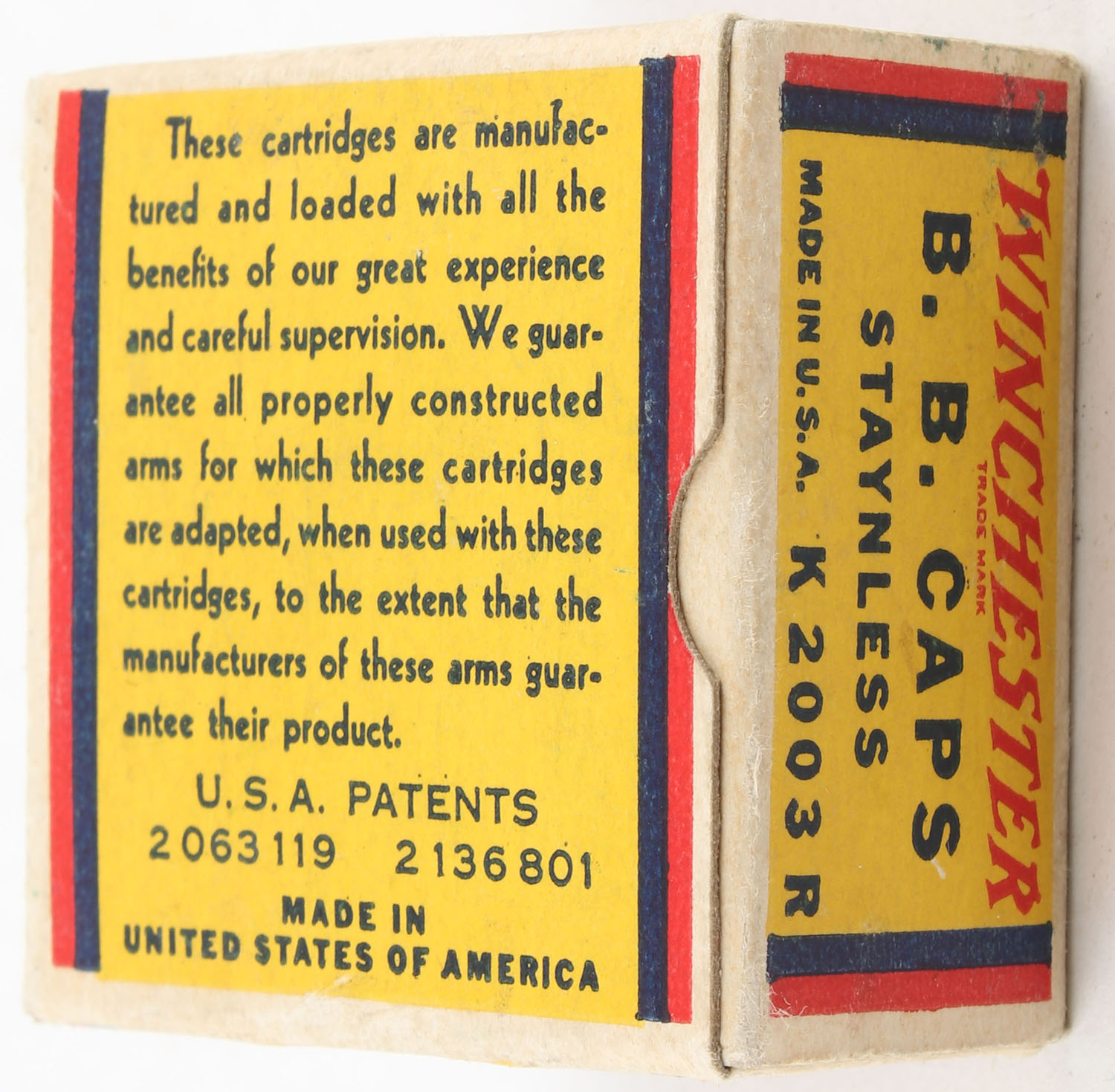 Winchester, Staynless, B.B. Caps, RHWeb: WRA-15 BB-1, Full, 1pc. Yellow blue & red box, box is solid with excellent to minty color, very minor corner wear, edges are crisp, end flaps are solid, ammo is excellent. Grade: Excellent ++ - Value: 60 to 90