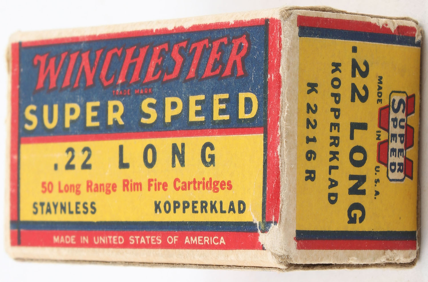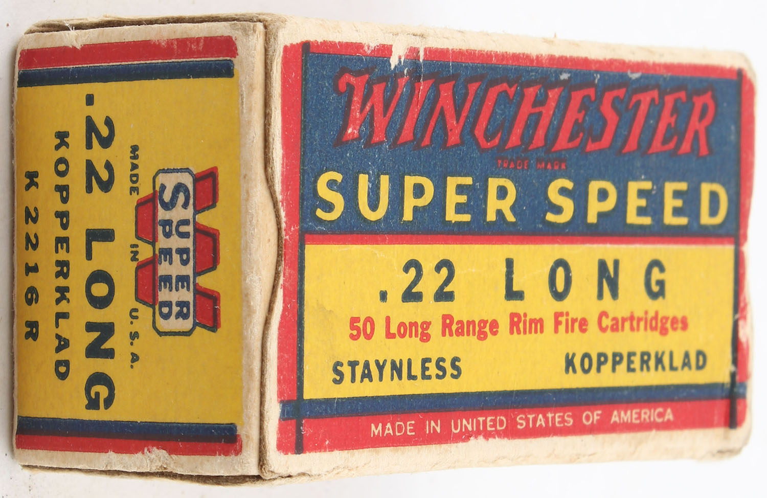 Winchester, Super Speed, .22 Long, RHWeb: WRA-15 L-1b, Full, 1pc. Yellow blue & red box, box is solid with excellent color, very minor age soiling & shelf wear, corner wear, very minor edge wear, end flaps are solid, ammo is excellent. Grade: Very Good + - Value: 12 to 24