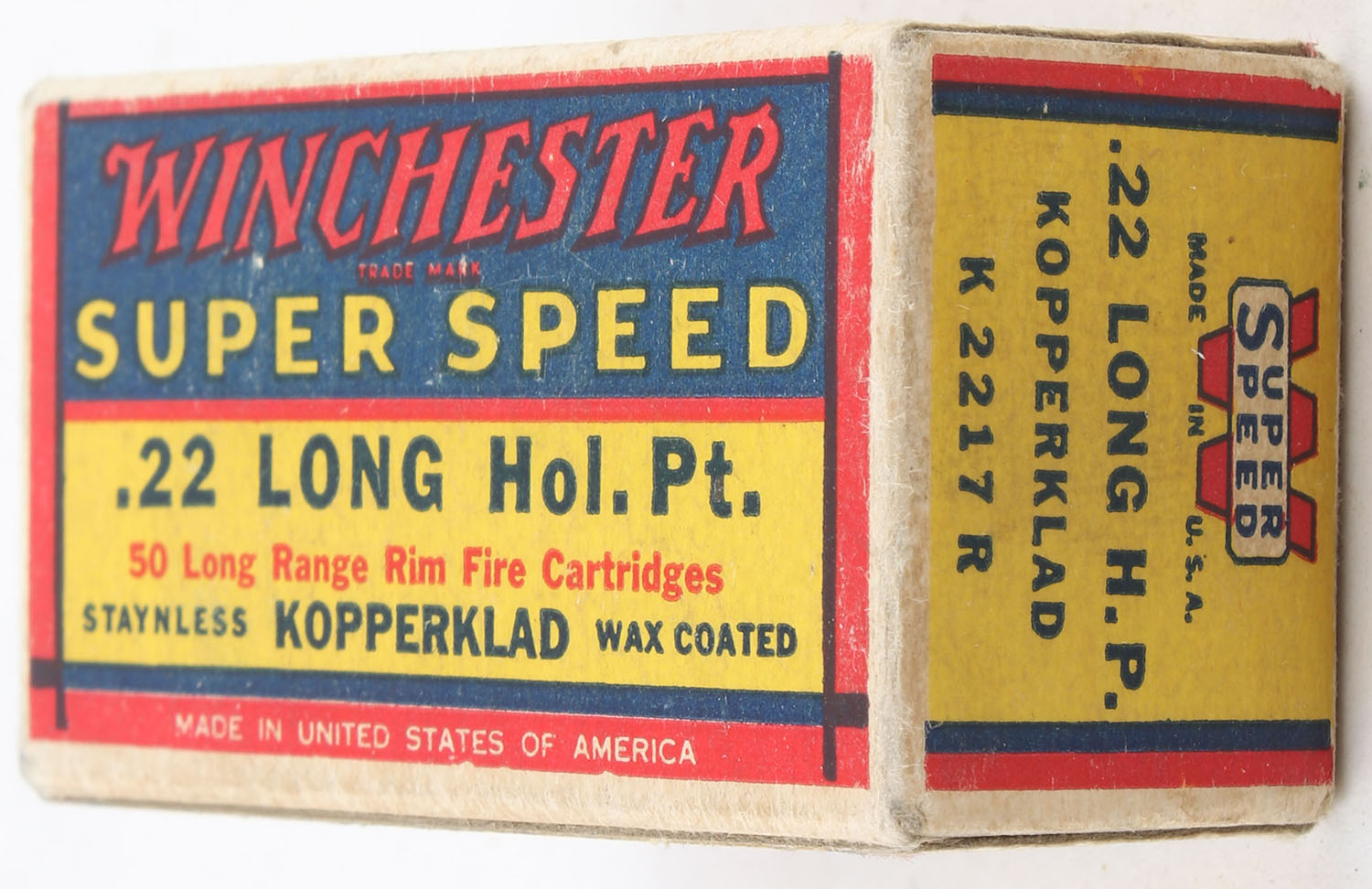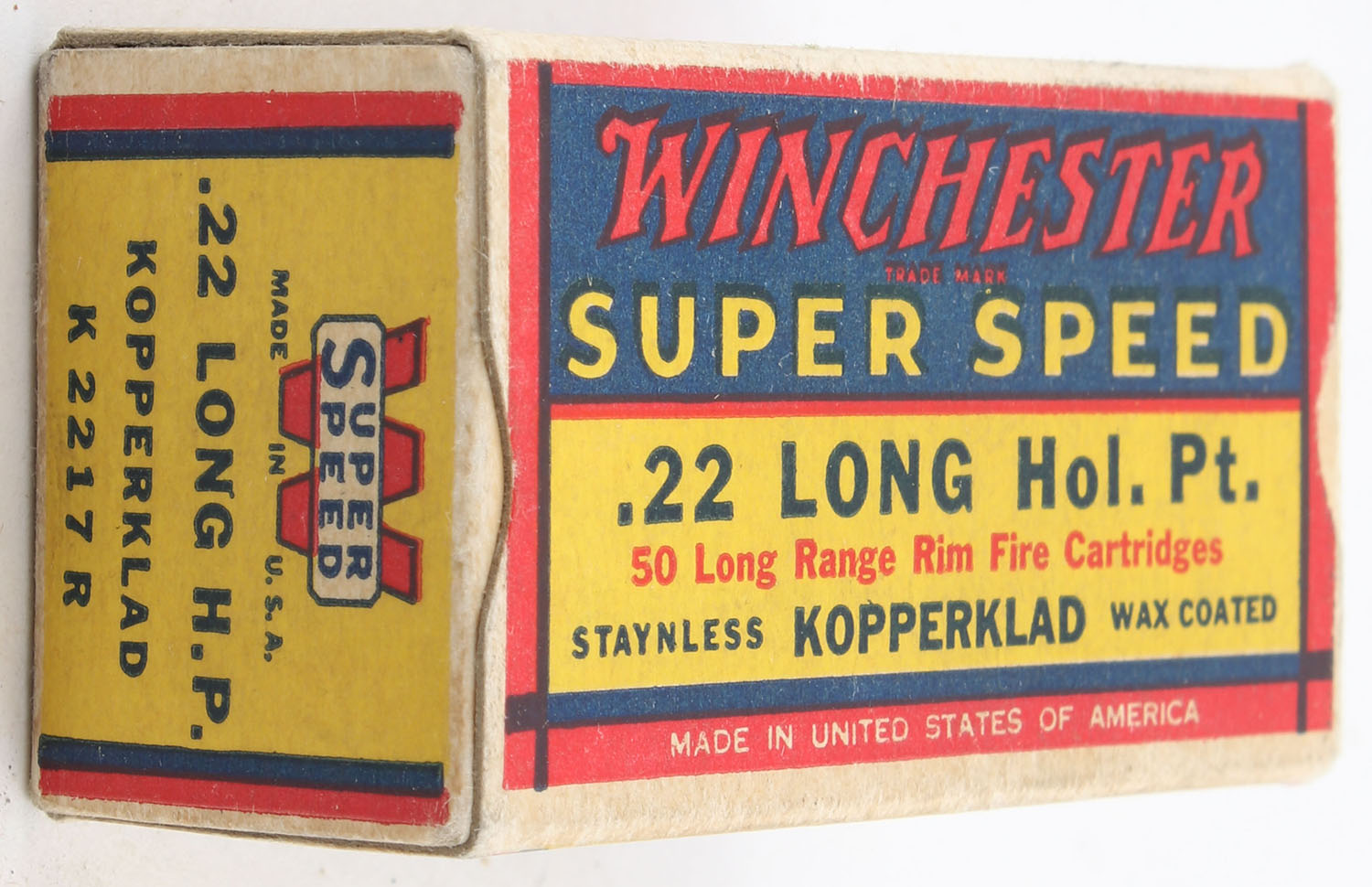 Winchester, Super Speed, .22 Long Hollow Point, RHWeb: WRA-15 L-1b, Full, 1pc. Yellow blue & red box, box is solid with excellent color, very minor age soiling & corner wear, edges are crisp, end flaps are solid, ammo is excellent. Grade: Excellent - Value: 100 to 150