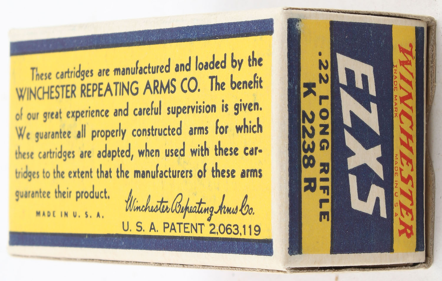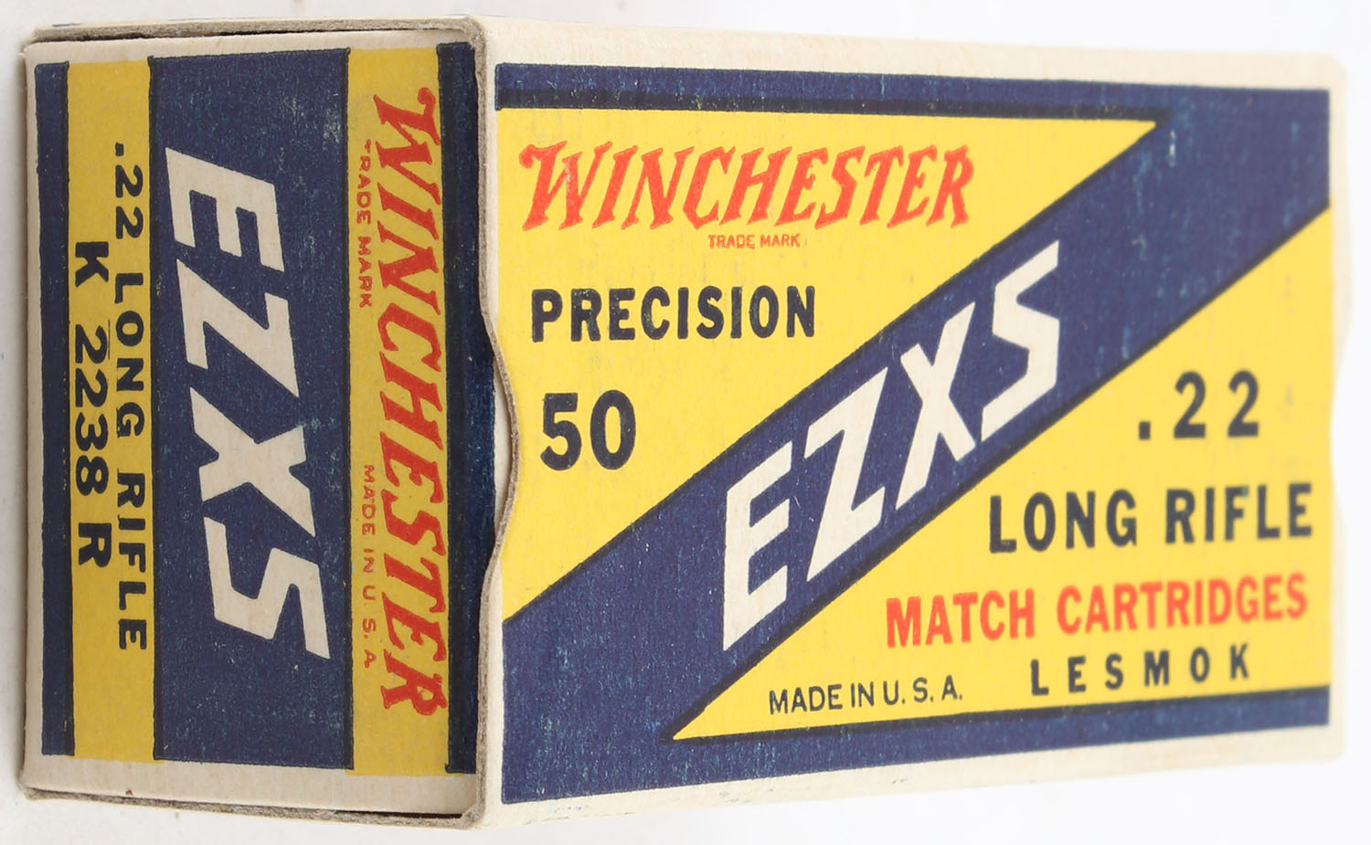 Winchester, EZXS, .22 Long Rifle, Match Cartridges, RHWeb: WRA-54 LR-3b, Full, 1pc. Yellow blue & red box, box is near mint with minty color, only very minor shelf wear, corners are sharp, edges are crisp, end flaps are solid, ammo is excellent. Grade: Excellent ++ - Value: 20 to 30