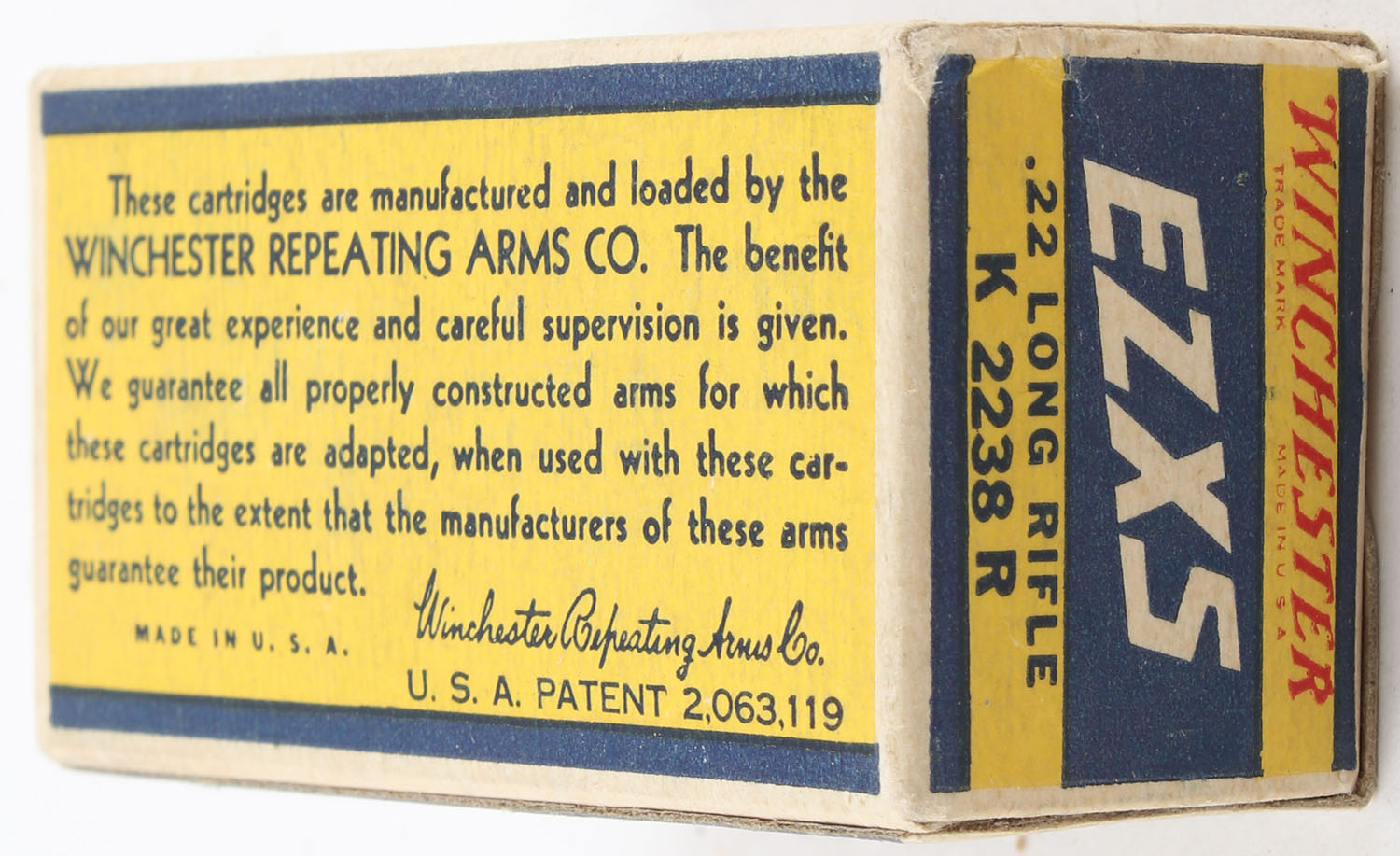 Winchester, EZXS, .22 Long Rifle, Match Cartridges, RHWeb: WRA-54 LR-3b, Full, 1pc. Yellow blue & red box, box is solid with excellent color, minor corner wear, edges are crisp, end flaps are solid, ammo is excellent. Grade: Excellent - Value: 20 to 30