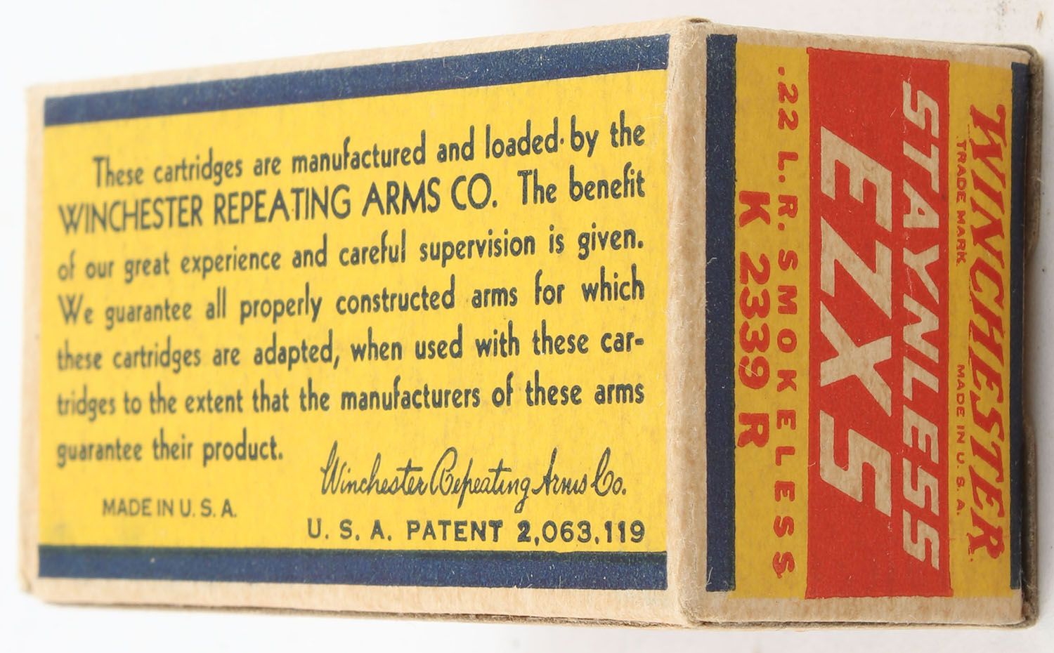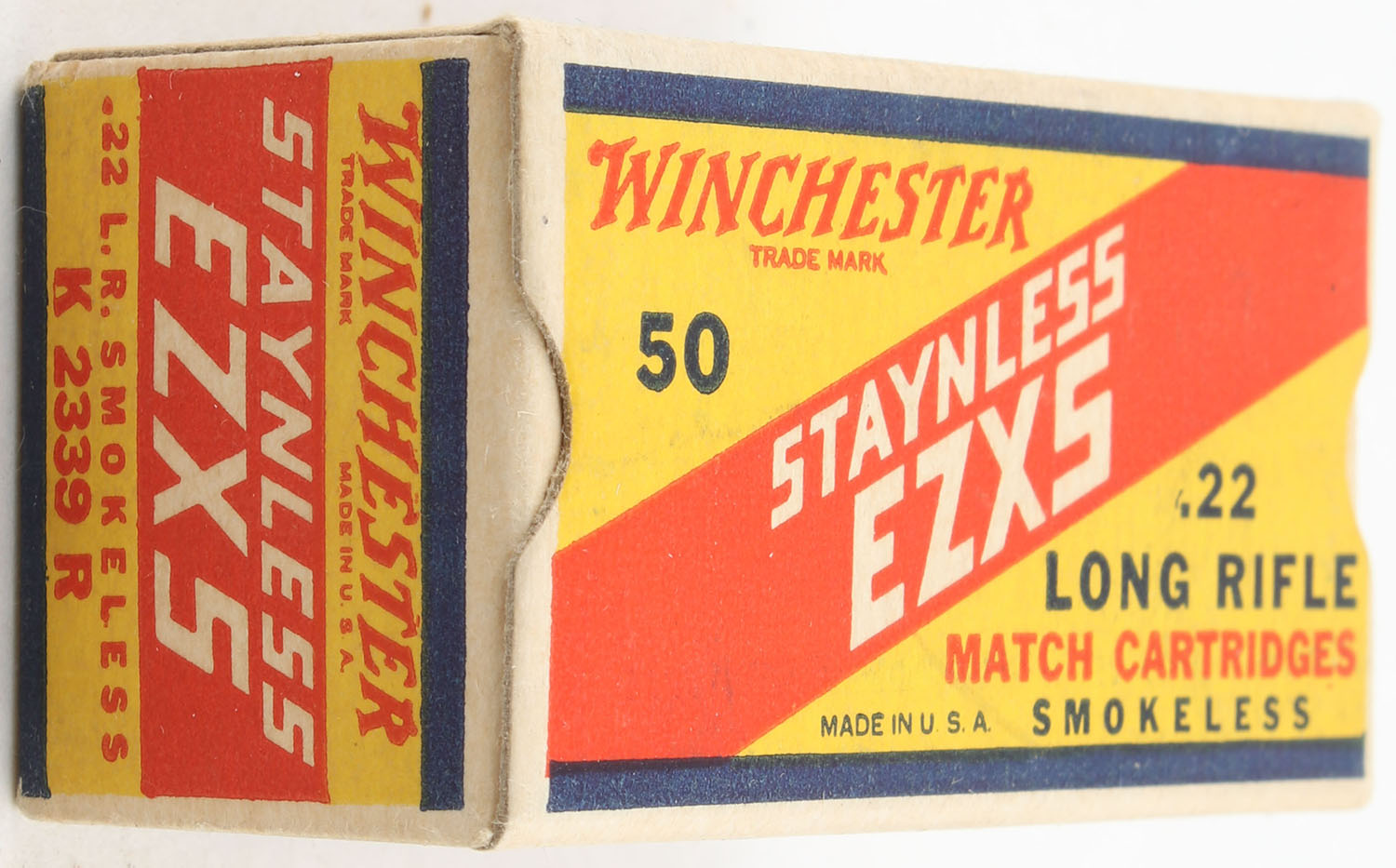 Winchester, Staynless EZXS, .22 Long Rifle, Match Cartridges, RHWeb: WRA-54 LR-5, Full, 1pc. Yellow red & blue box, box is solid with excellent color, very minor age soiling, corners are mostly sharp, edges are crisp, end flaps are solid, ammo is excellent. Grade: Excellent ++ - Value: 80 to 120