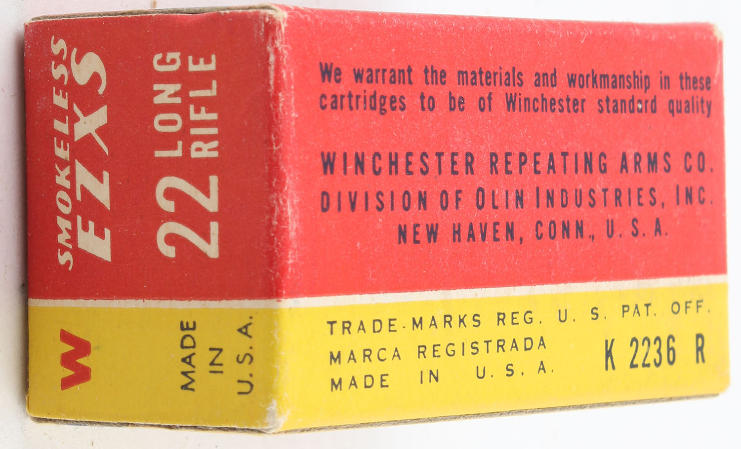 Winchester, Smokeless EZXS, .22 Long Rifle, RHWeb: WRA-54 LR-7a, Full, 1pc. Red yellow & blue box, box is solid with excellent color, very minor corner wear, edges are crisp, end flaps are solid, ammo is very good. Grade: Excellent + - Value: 10 to 15