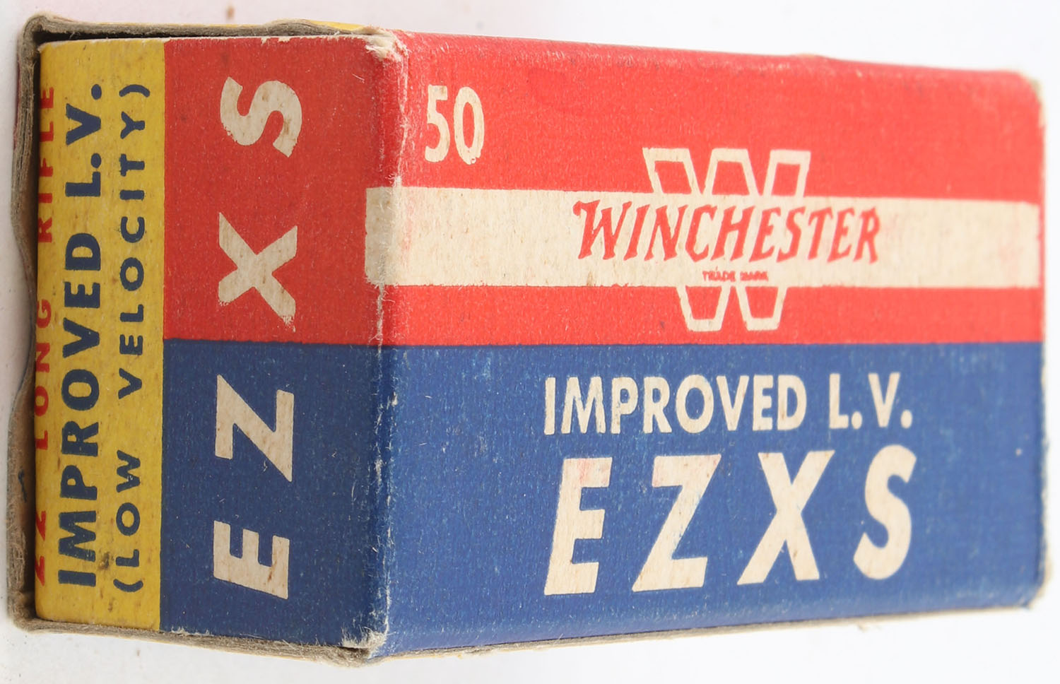 Winchester, Improved L.V. EZXS, .22 Long Rifle, RHWeb: WRA-54 LR-8b, Full, 1pc. Blue yellow & red box, box is solid with excellent color, very minor age soiling, minor corner wear, edges are mostly crisp, end flaps are solid, ammo is excellent. Grade: Excellent - Value: 40 to 60