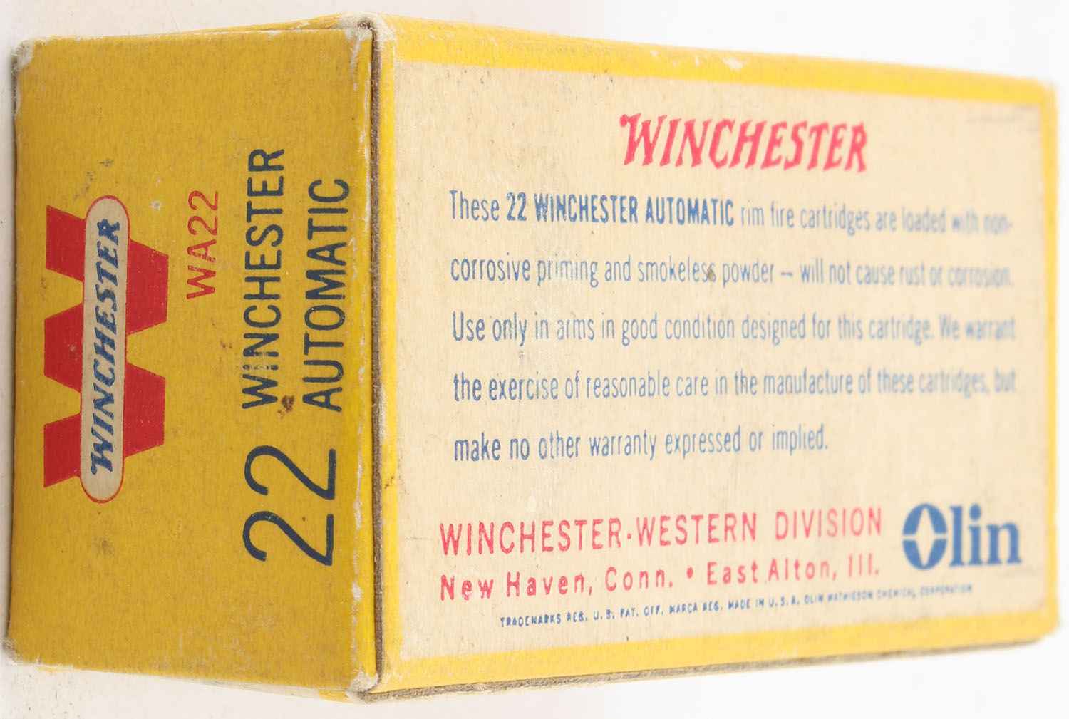 Winchester, W, .22 Winchester Automatic, RHWeb: WRA-19 WA-1b, Full, 1pc. Yellow red & white box, box is solid with excellent color, very minor age soiling & corner wear, edges are mostly crisp, end flaps are solid, ammo is excellent to minty. Grade: Excellent - Value: 24 to 36