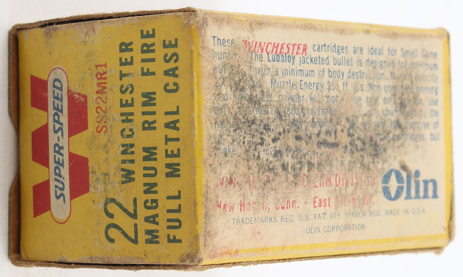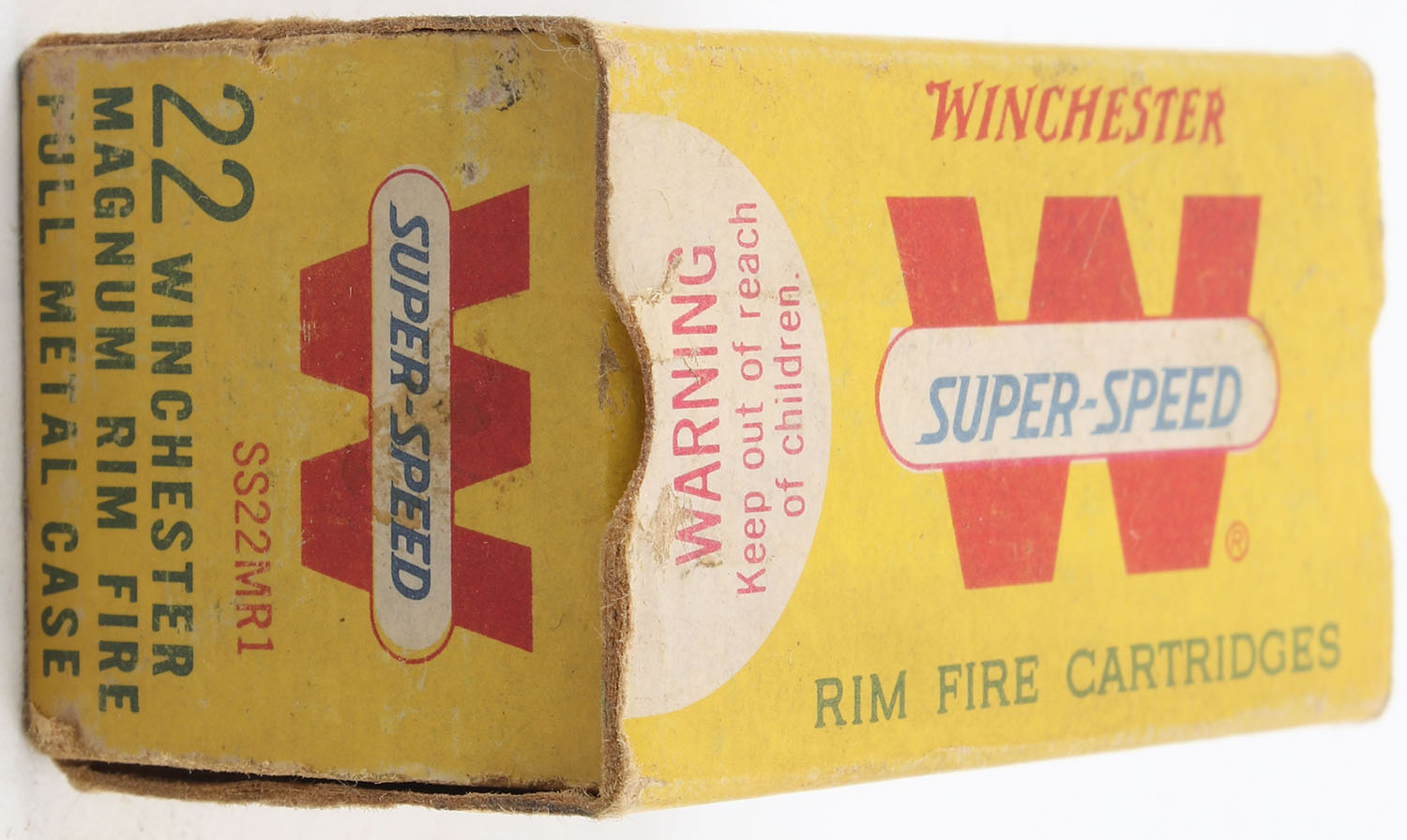 Winchester, Super-Speed, .22 Winchester Magnum, Full Metal Case, RHWeb: WRA-20 WMR-1c, Full, 1pc. Yellow red & white box, box is solid with good color, some age soiling, shelf wear, front has been written on, minor corner wear, edges are mostly crisp, end flaps are solid, ammo is excellent. Grade: Good ++ - Value: 16 to 24