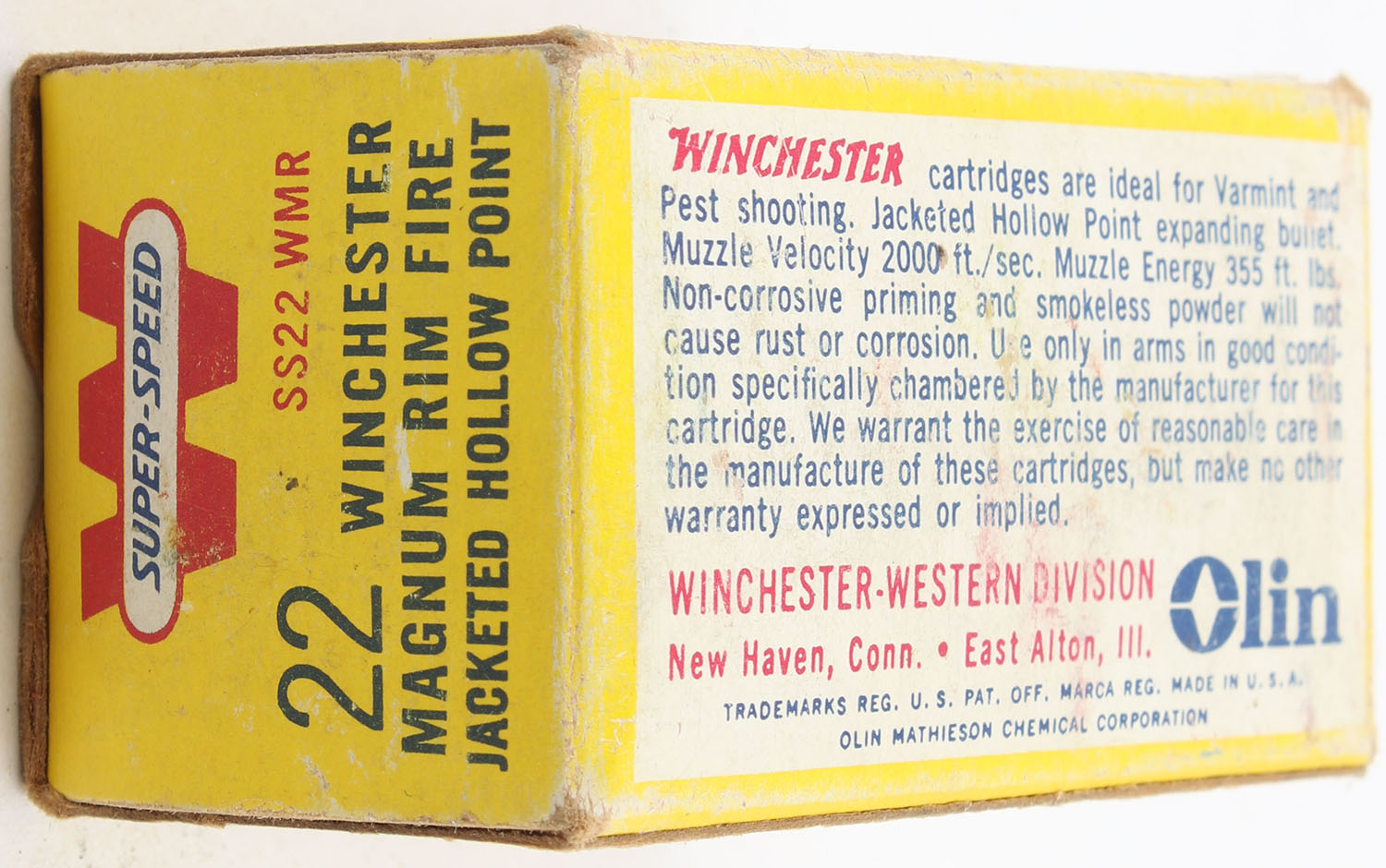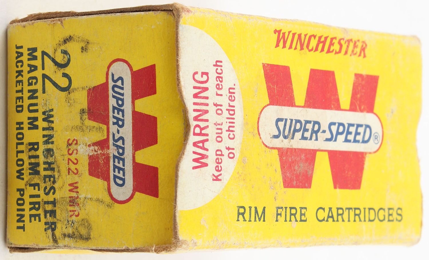 Winchester, Super-Speed, .22 Winchester Magnum, 40 Grain Jacketed Hollow Point, Full, 1pc. Yellow red & white box, box is solid with excellent color, some shelf & corner wear, edges are mostly crisp, end flaps are solid, ammo is excellent. Grade: Excellent - Value: 16 to 24