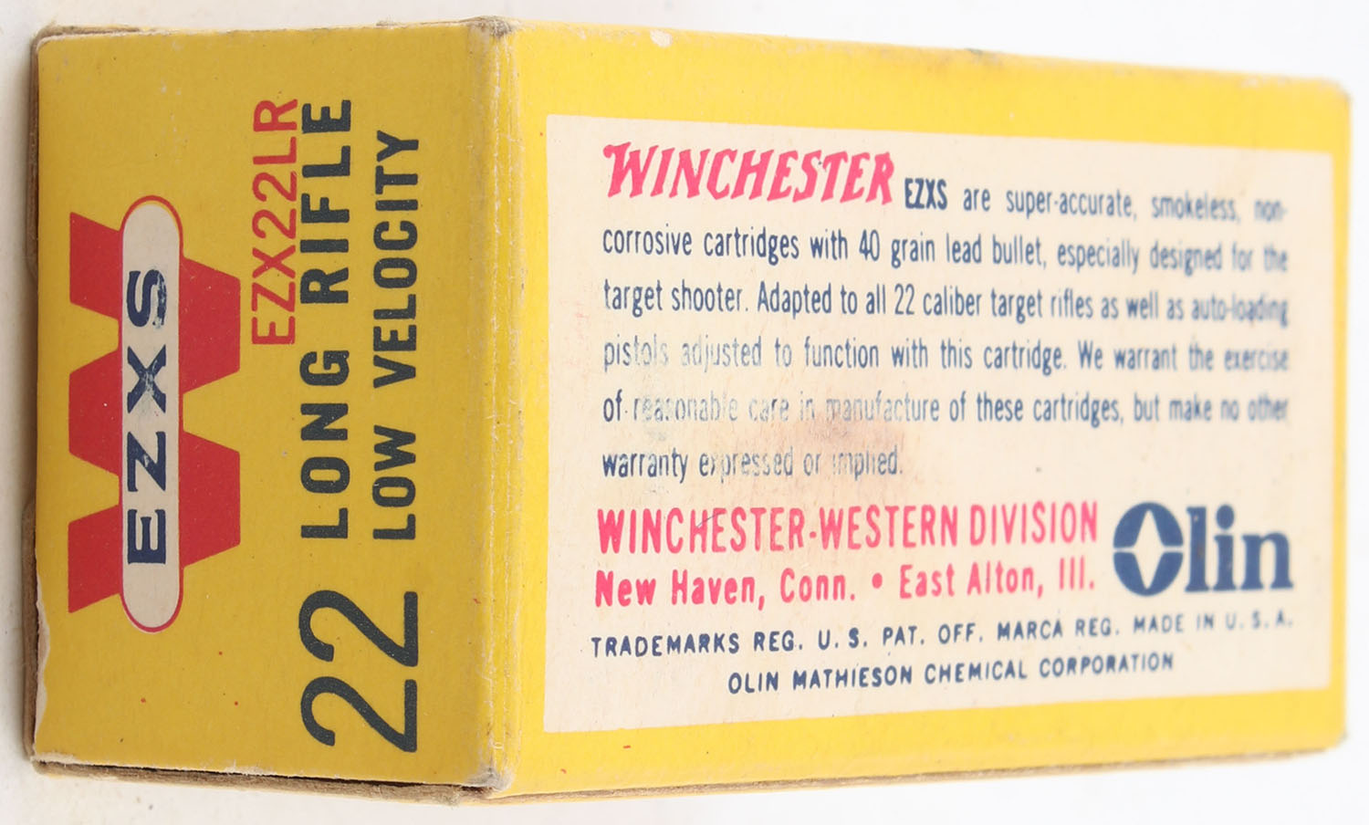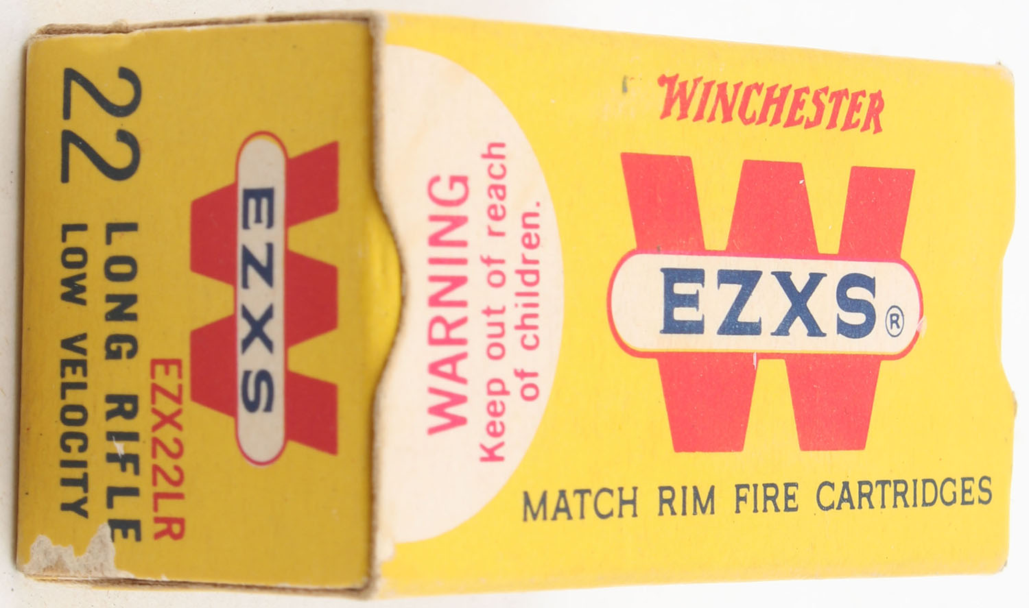 Winchester, EZXS, .22 Long Rifle, Low Velocity, RHWeb: WRA-54 LR-12, Full, 1pc. Yellow red & white box, box is solid with excellent color, very minor corner wear, edges are crisp, end flaps are solid, ammo is excellent. Grade: Excellent + - Value: 8 to 12