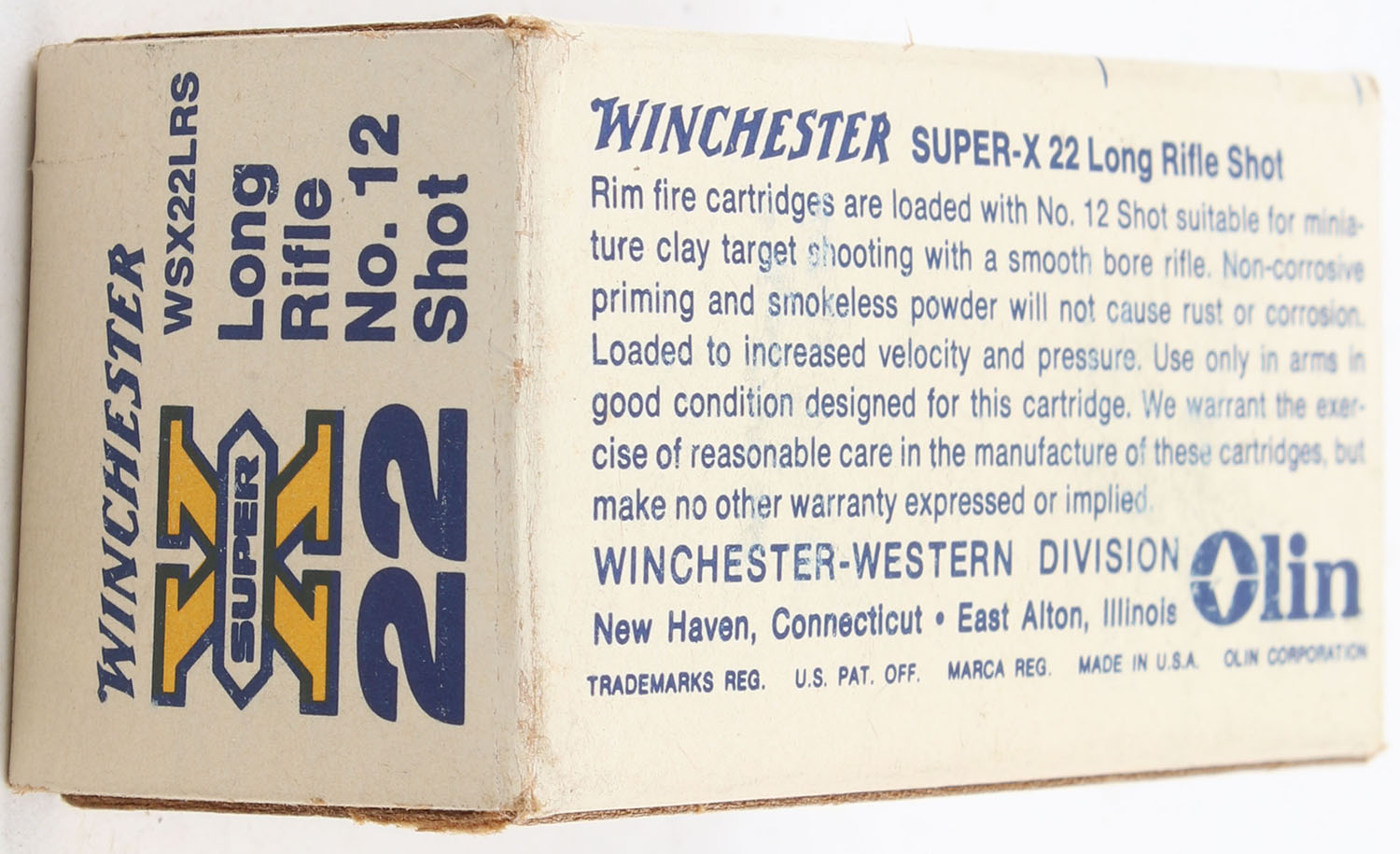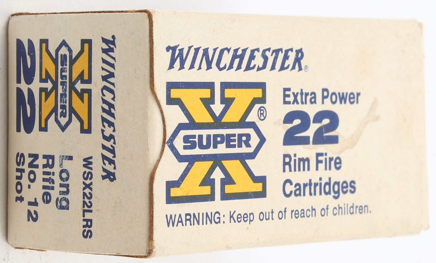 Winchester, Super X, .22 Long Rifle Shot, RHWeb: WRA-21 LR-5, Full, 1pc. White blue & yellow box, box is solid with very good color, minor age soiling, stain on top, very minor edge & corner wear, end flaps are solid, ammo is minty. Grade: Very Good ++ - Value: 16 to 24