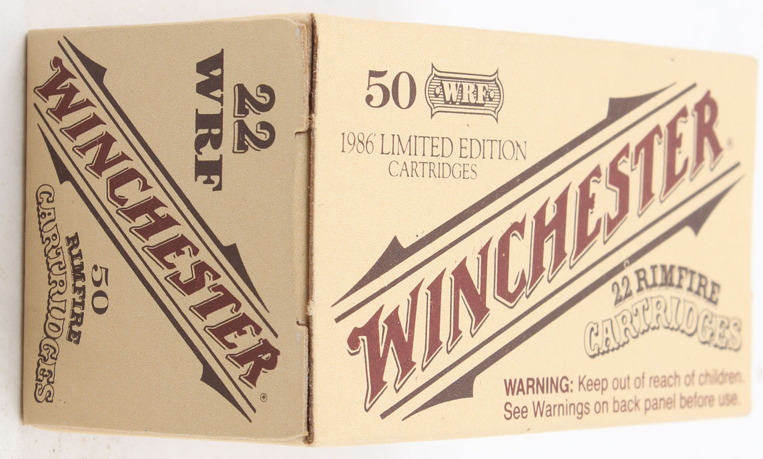 Winchester, 1986 Limited Edition Cartridges, .22 W.R.F., RHWeb: WRA-H&R-72, WRF-1a, Full, 1pc. Tan and brown box, box is MINT with mint color, corners are sharp, edges are crisp, end flaps are solid, ammo is mint. Grade: MINT - Value: 12 to 18