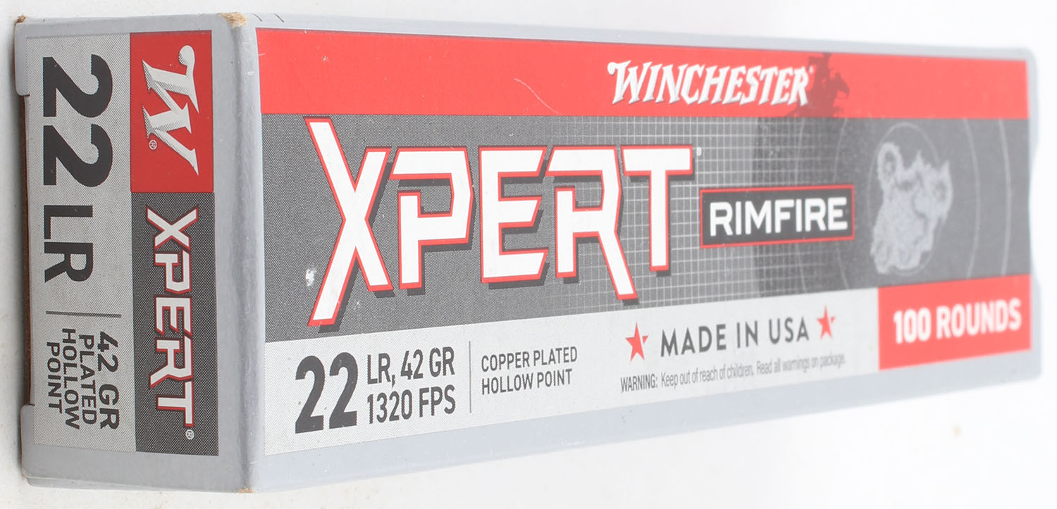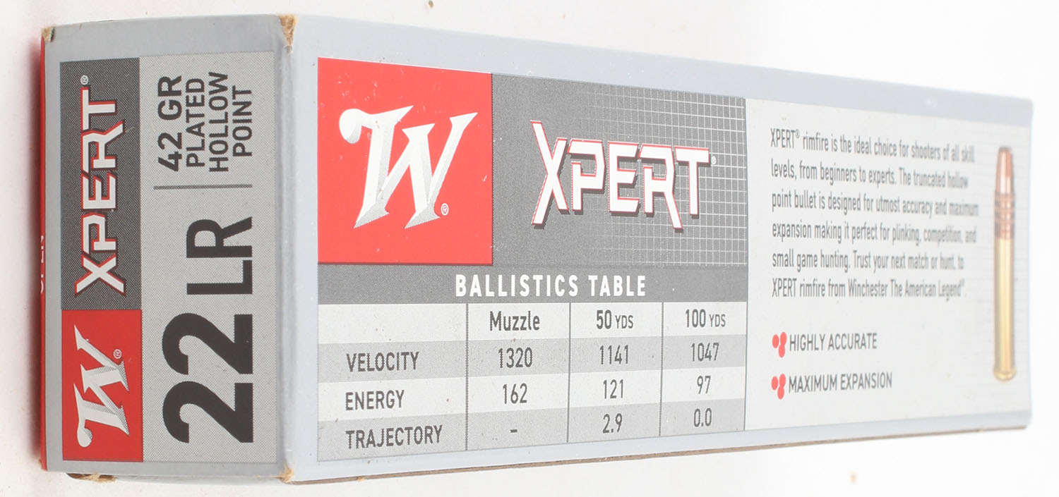 Winchester, Xpert, .22 Long Rifle, 42 Grain Copper Plated Hollow Point, 1320 FPS, Full, 100rds., 1pc. Gray red & white box, box is MINT with minty color, corners are sharp, edges are crisp, end flaps are solid, ammo is mint. Grade: MINT - Value: 10 to 15