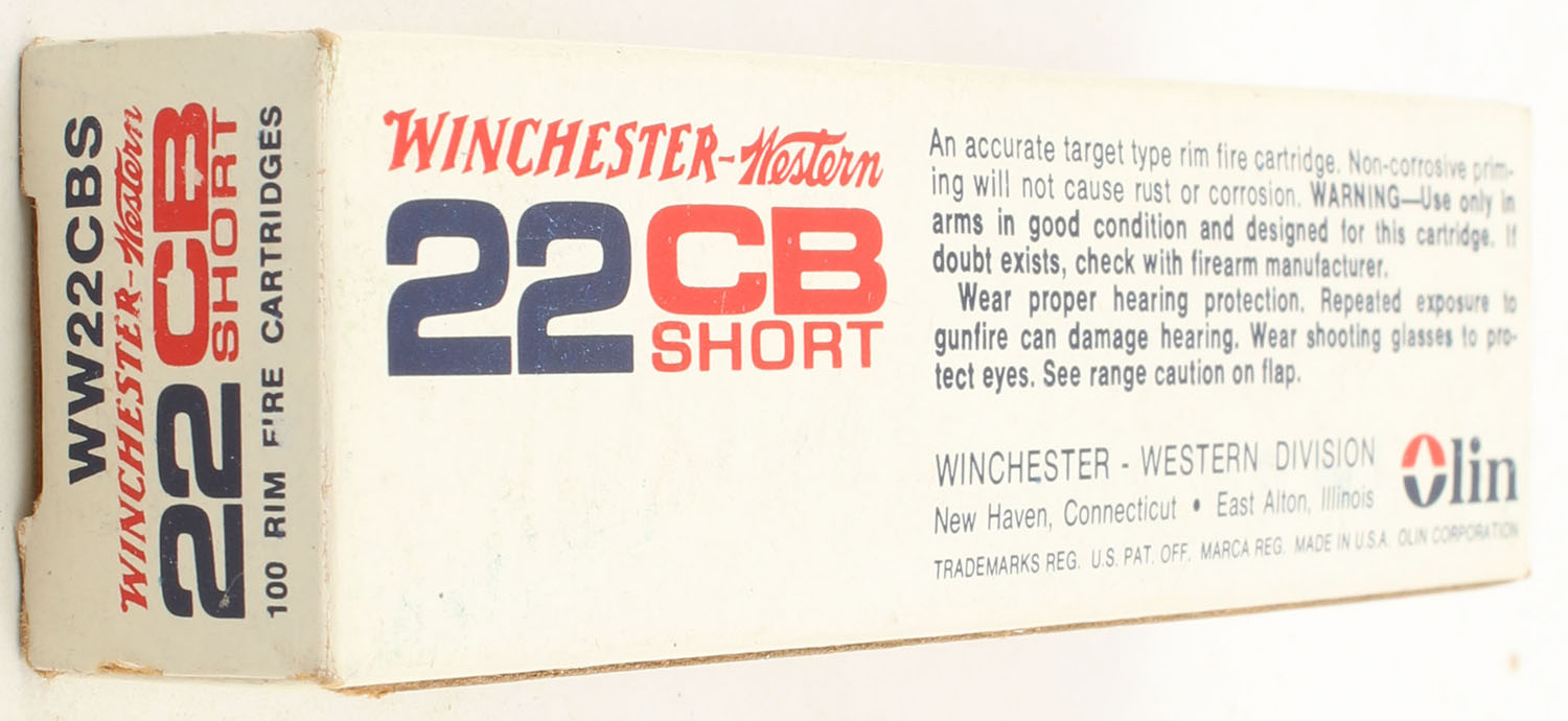 Winchester-Western, .22 C.B. Short, Low Velocity, RHWeb: WW-1 CB-1, Full, 1pc. White red & blue box, box is solid with excellent color, very minor age soiling & corner wear, edges are crisp end flaps are solid, ammo is minty. Grade: Excellent + - Value: 24 to 36