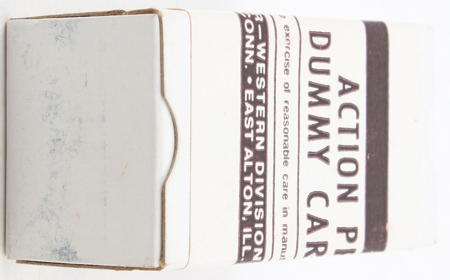 Winchester-Western, Action Proving Dummy Cartridges, .22 Long Rifle, RHWeb: WW-3 LR-1, Full, 1pc. White box with white & black label, box is near mint with minty color, only very minor corner wear on one corner, corners otherwise sharp, edges are crisp, end flaps are solid, ammo is minty. Grade: Excellent ++ - Value: 10 to 15