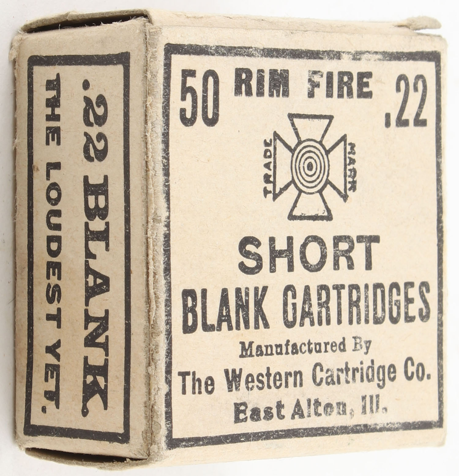Western, Blank Cartridges, .22 Short, RHWeb: WCC-1 S-1, Full, 1pc. Buff box with black printing, box is solid with excellent color, very minor edge & corner wear, end flaps are solid, ammo is good to very good. Grade: Excellent - Value: 20 to 30