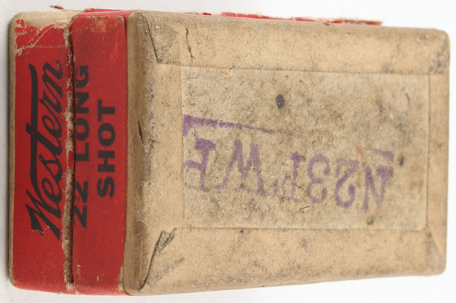 Western, Rim Fire Cartridges, .22 Long Shot, RHWeb: WCC-3 L-14, Full, 2pc. Buff box with green top & red side sealing labels, box is solid with very good color, minor age soiling, very minor edge & corner wear, labels are intact, ammo is excellent. Grade: Very Good ++ - Value: 80 to 120