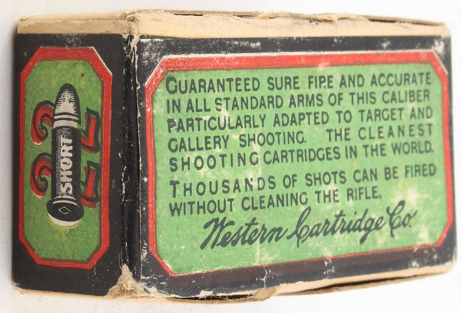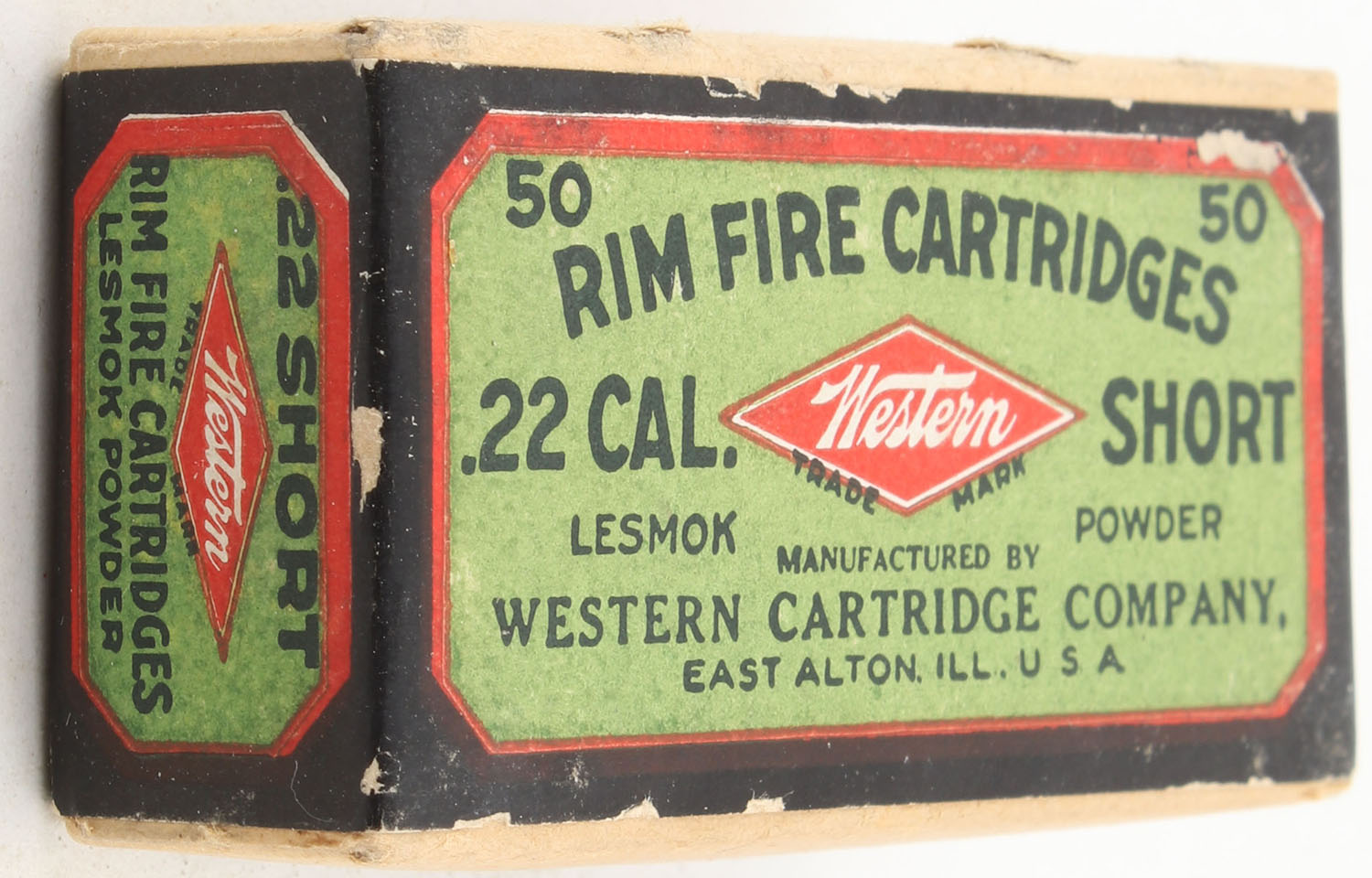 Western, Rim Fire Cartridges, .22 Short, Lesmok Powder, RHWeb: WCC-3 S-10, FULL & SEALED, 2pc. Buff box with green black & red box, box is solid with excellent color, minor edge & corner wear, label is intact. Grade: Excellent - Value: 50 to 75