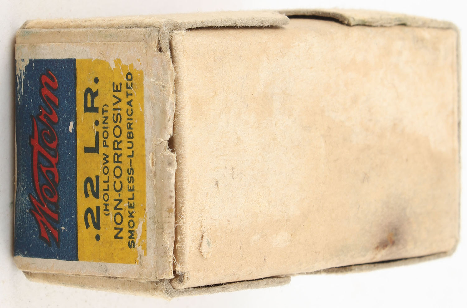Western, Rim Fire Cartridges, .22 Long Rifle Hollow Point, Smokeless Powder, RHWeb: WCC-4.1 LR-1, Full, 2pc. Buff box with blue & yellow wraparound bulls eye label, box is solid with very good color, some age soiling & color bleeding, minor corner wear, very minor edge wear, label is 90% intact, ammo is very good. Grade: Very Good - Value: 40 to 60