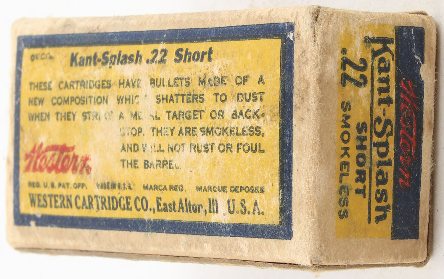 Western, Kant-Splash, .22 Short, Smokeless, RHWeb: WCC-49 S-1d, Partial 28rds. 1pc. Yellow blue & red bulls eye box, box is solid with good color, age soiling, some shelf wear, some edge & corner wear, end flaps are solid, ammo is very good. Grade: Good ++ - Value: 40 to 60