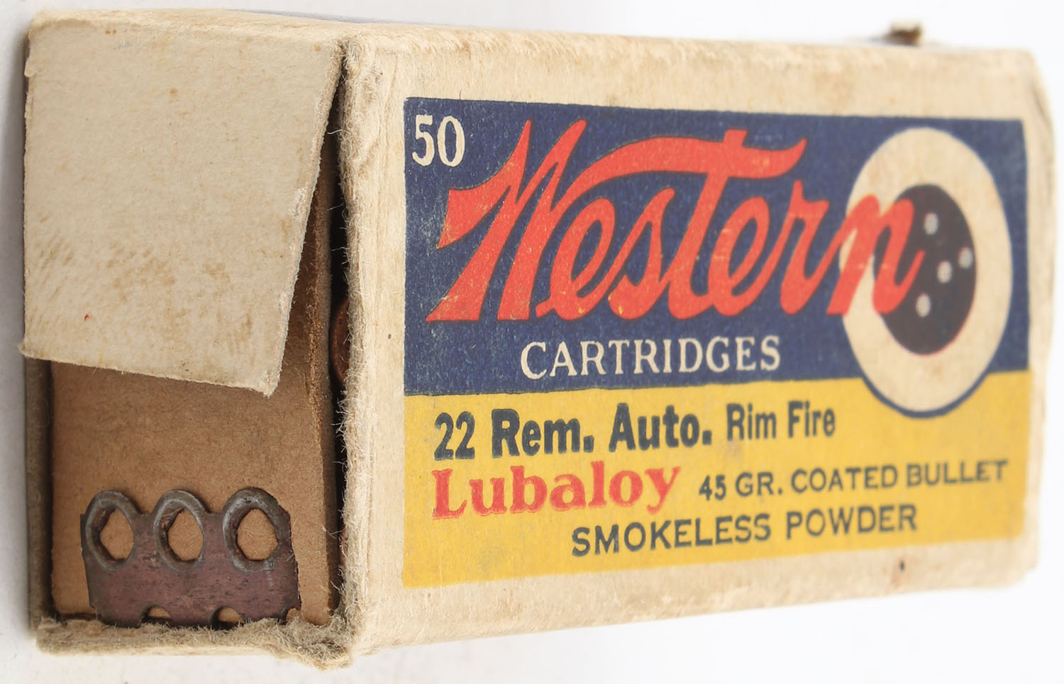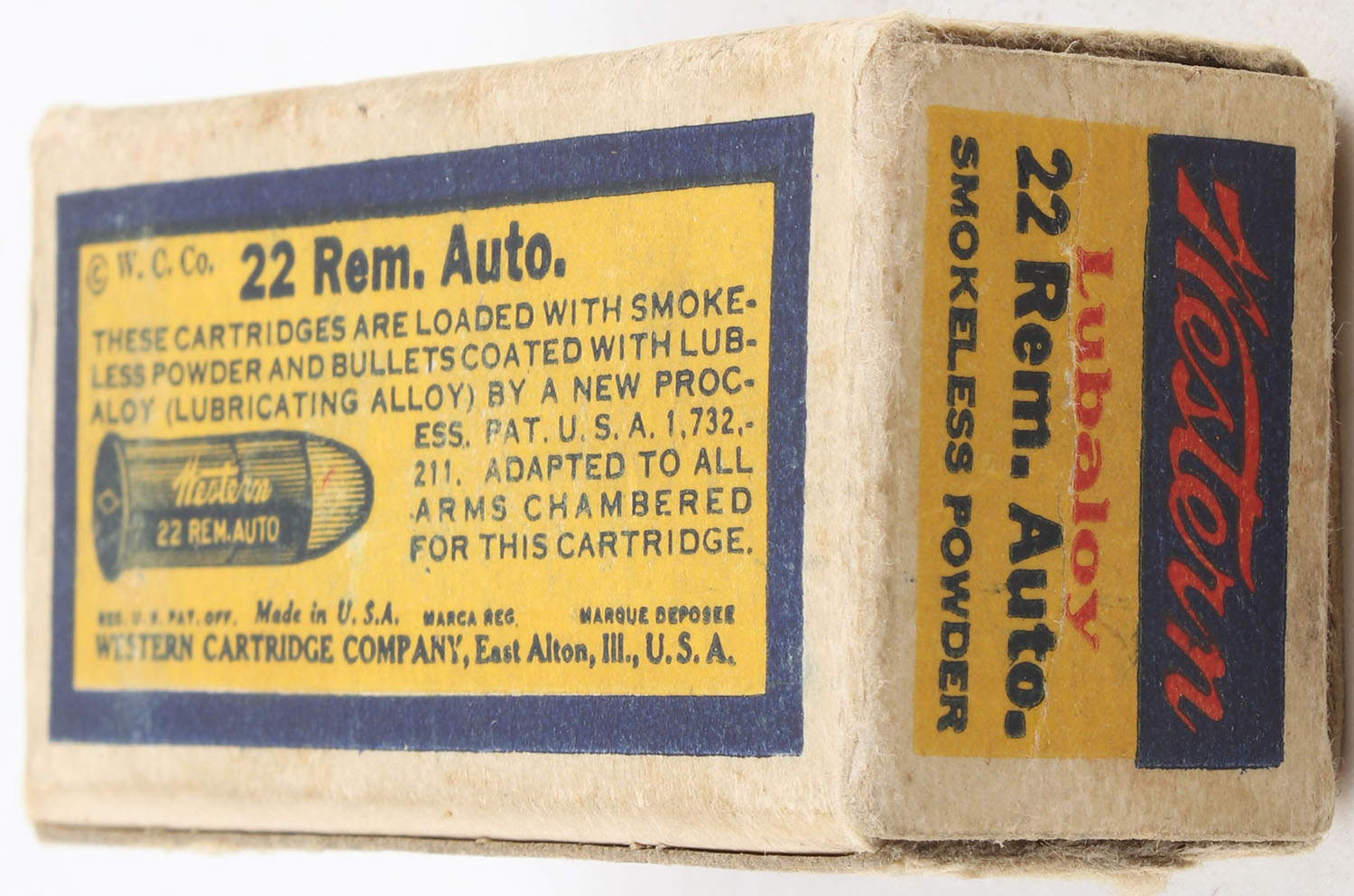 Western, Cartridges, .22 Remington Automatic, 45 Grain Lubaloy Coated Bullet, Not in RHWeb, Partial 49rds. 1pc. Yellow blue & red bulls eye box, missing left end flap, very good color, some age soiling, minor edge & corner wear, right end flap is solid, ammo is excellent. Grade: Good + - Value: 50 to 75