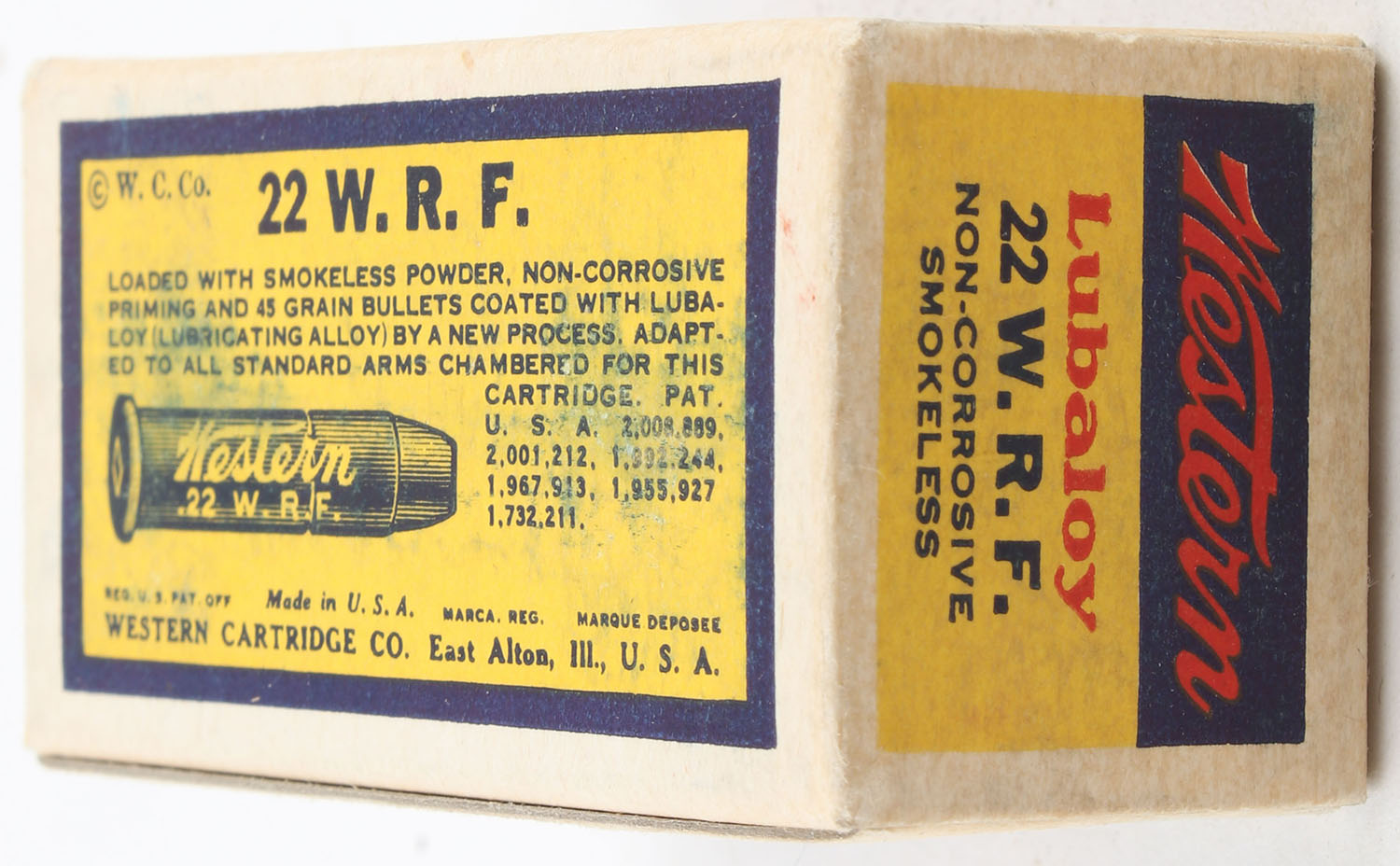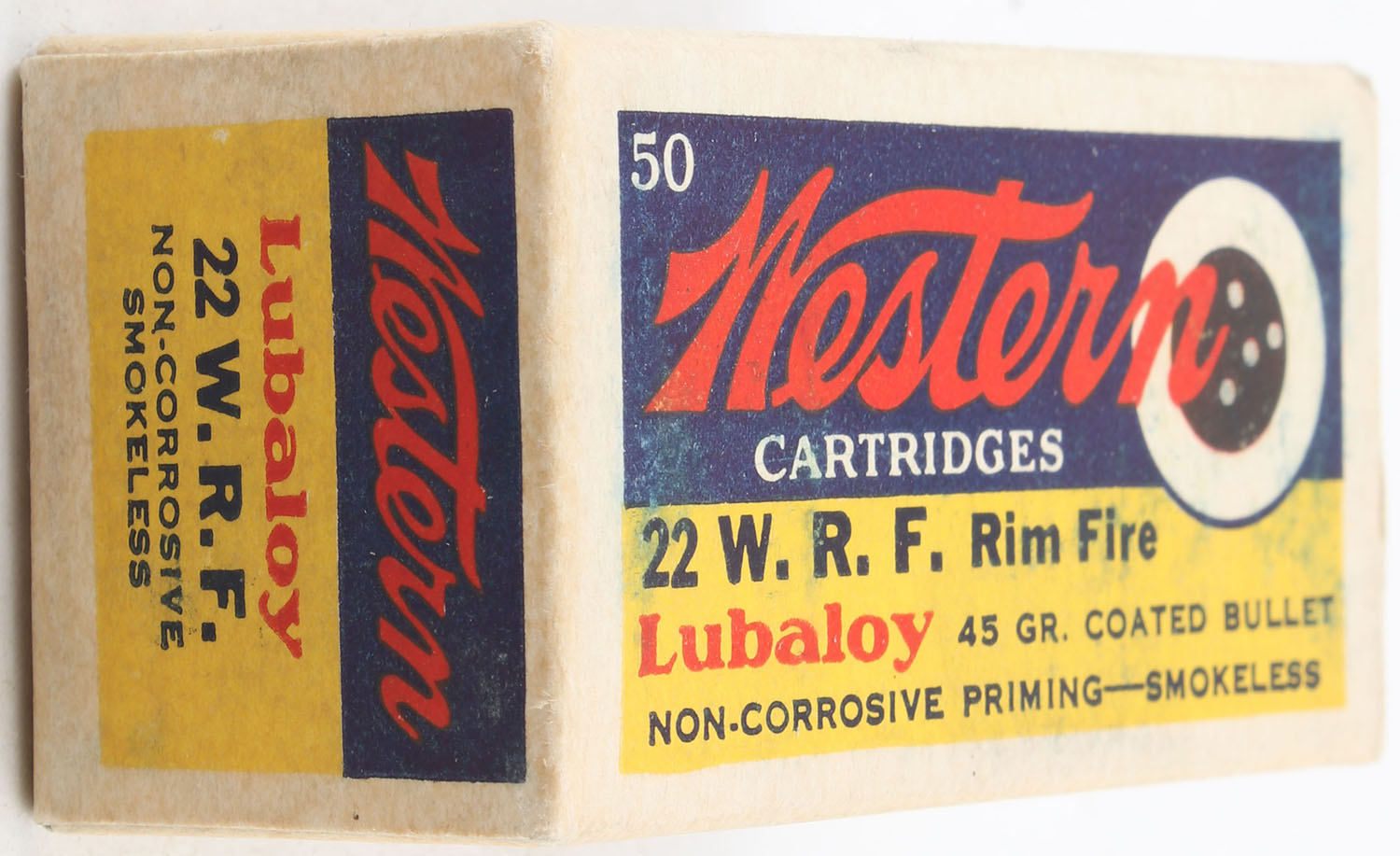 Western, Cartridges, .22 W.R.F., 45 Grain Lubaloy Coated Bullet, RHWeb: WCC-4.4 WRF-1 (''2DB'' Bottom), Full, 1pc. Yellow blue & red bulls eye box, box is solid with excellent color, some color bleeding, corners are mostly sharp, edges are crisp, end flaps are solid, ammo is excellent to minty. Grade: Excellent - Value: 100 to 150