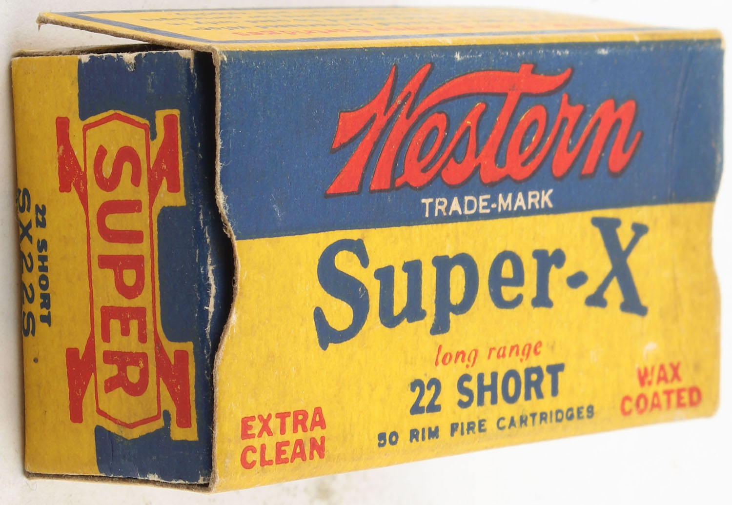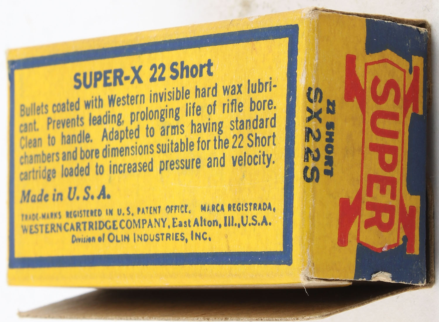 Western, Super-X, .22 Short, Extra Clean Wax Coated, RHWeb: WCC-Super-X-Shorts S-33, Full, 1pc. Yellow blue & red box, box is solid with excellent color, minor age soiling, factory seam has unadhered, very minor corner wear, edges are crisp, end flaps are solid, ammo is very good. Grade: Very Good ++ - Value: 10 to 15