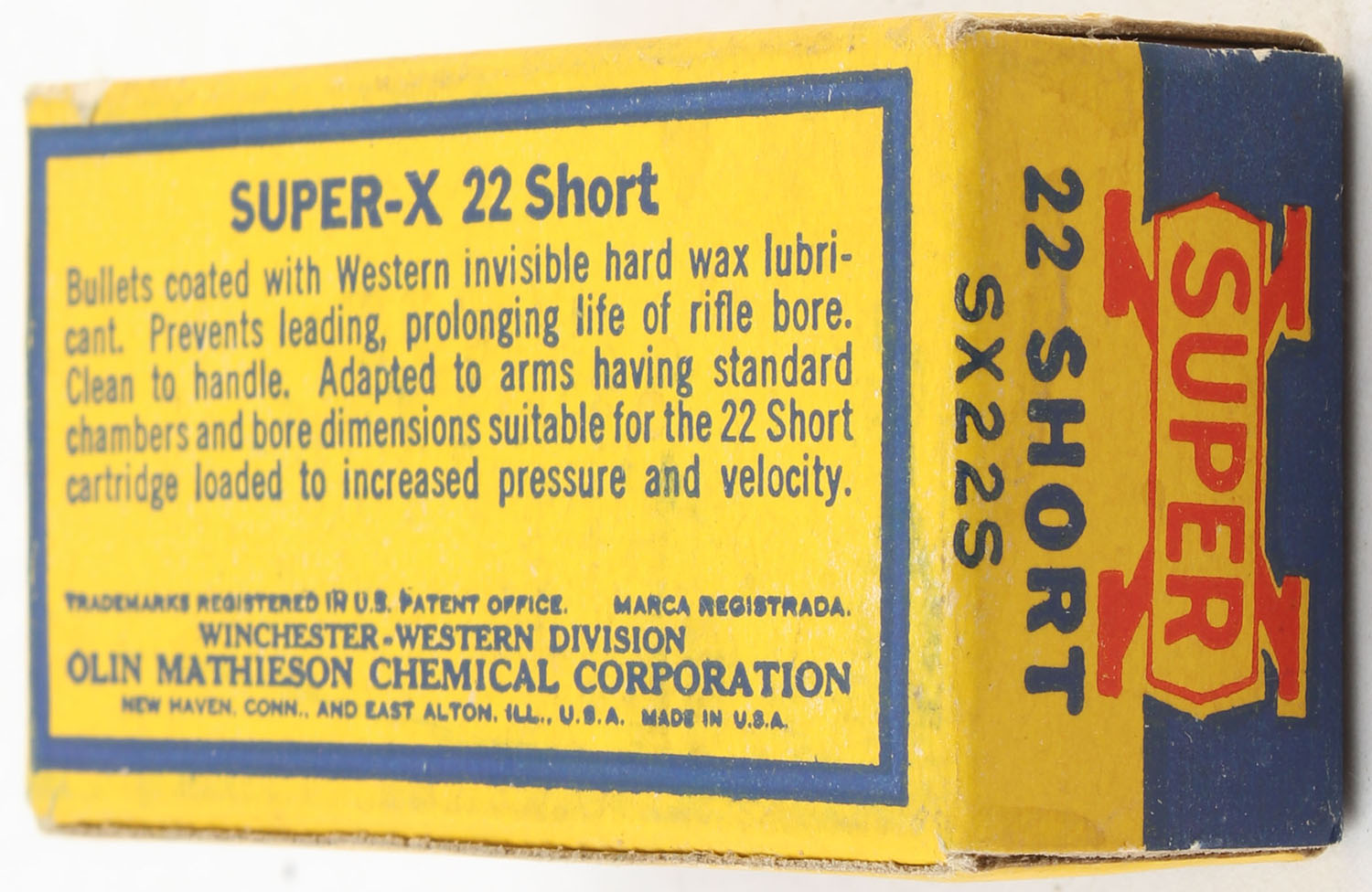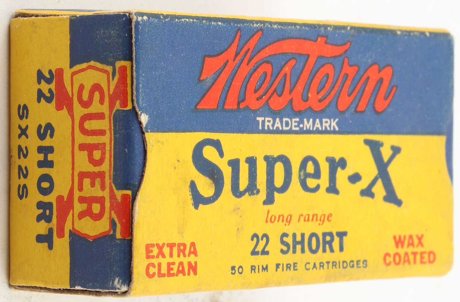 Western, Super-X, .22 Short, Extra Clean Wax Coated, RHWeb: WCC-Super-X-Shorts S-36, Full, 1pc. Yellow blue & red box, box is solid with excellent color, very minor staining on top, corners are mostly sharp, edges are crisp, end flaps are solid, ammo is excellent. Grade: Excellent + - Value: 10 to 15
