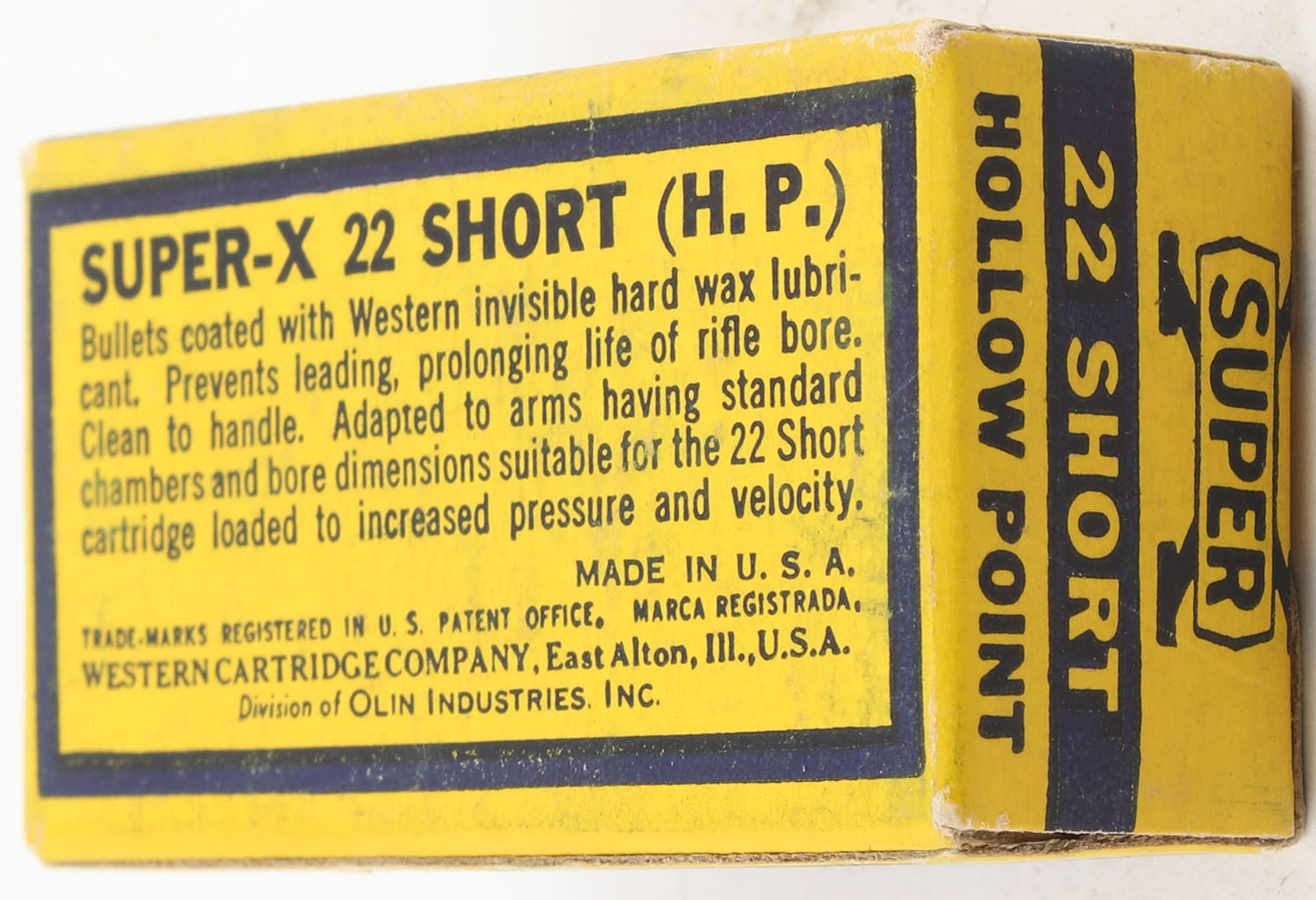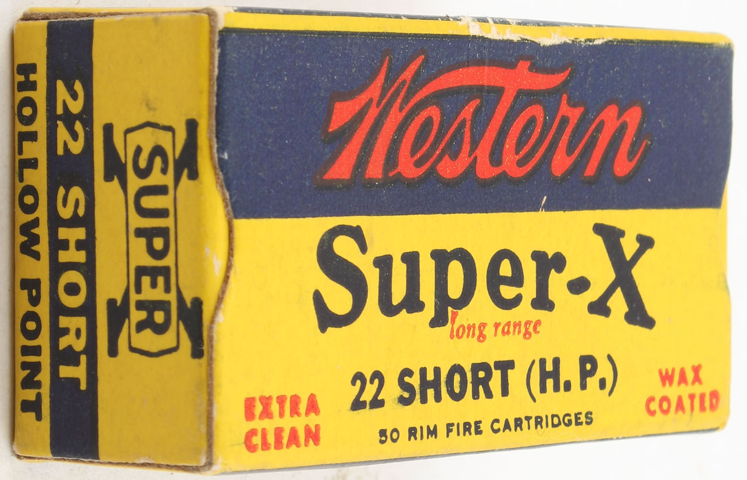 Western, Super-X, .22 Short Hollow Point, RHWeb: WCC-Super-X-Shorts SHP-23, Full, 1pc. Yellow blue & red box, box is solid with excellent to minty color, very minor edge wear, corners are mostly sharp, edges are crisp, end flaps are solid, ammo is excellent. Grade: Excellent ++ - Value: 16 to 24