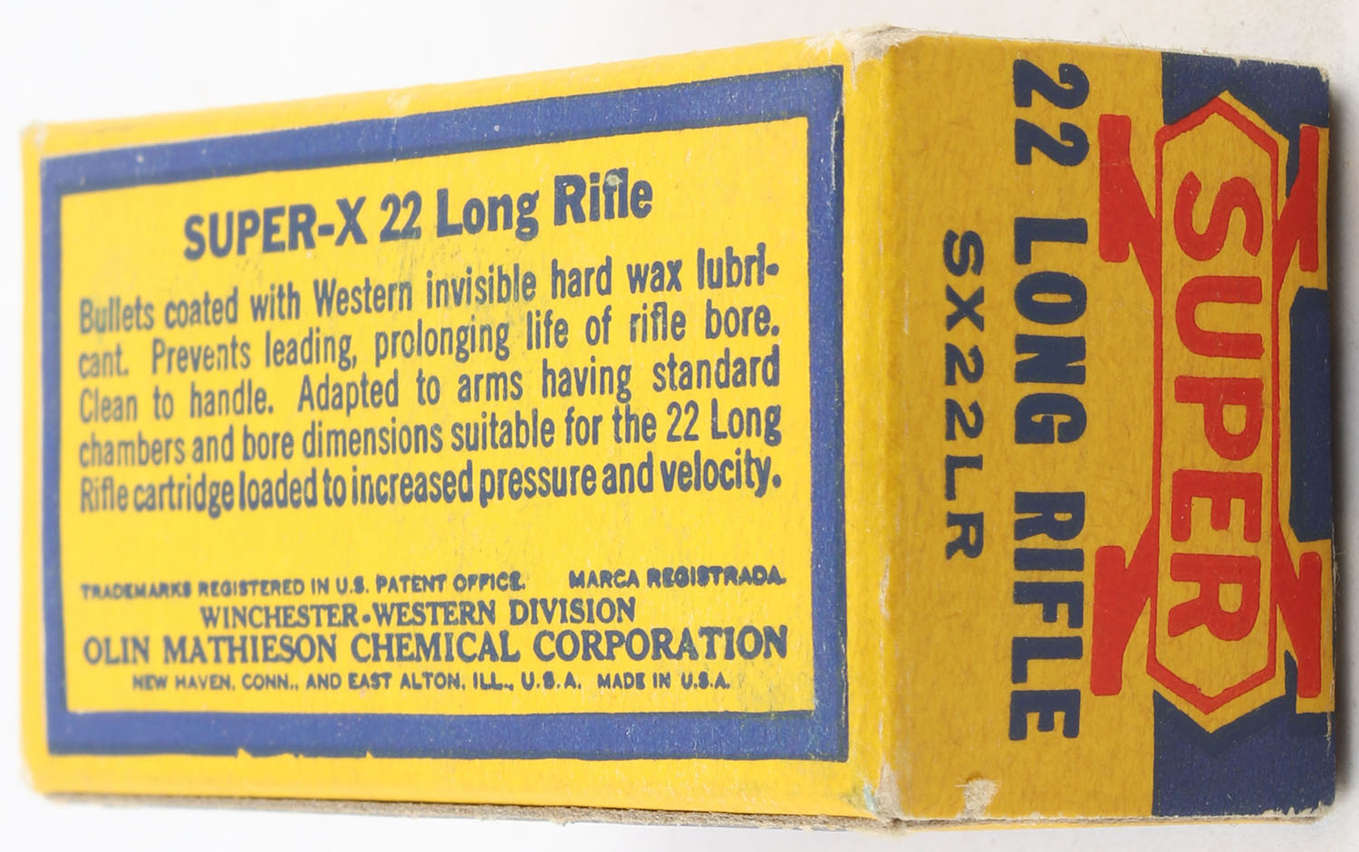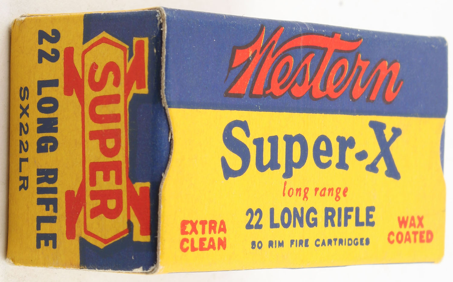 Western, Super-X, .22 Long Rifle, RHWeb: WCC-Super-X-Long Rifle LR-42, Full, 1pc. Yellow blue & red box, box is near mint with minty color, only very minor corner wear, edges are crisp, end flaps are solid, ammo is excellent to minty. Grade: Excellent ++ - Value: 12 to 18