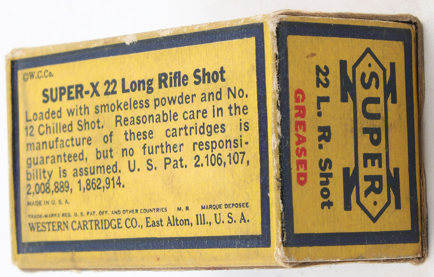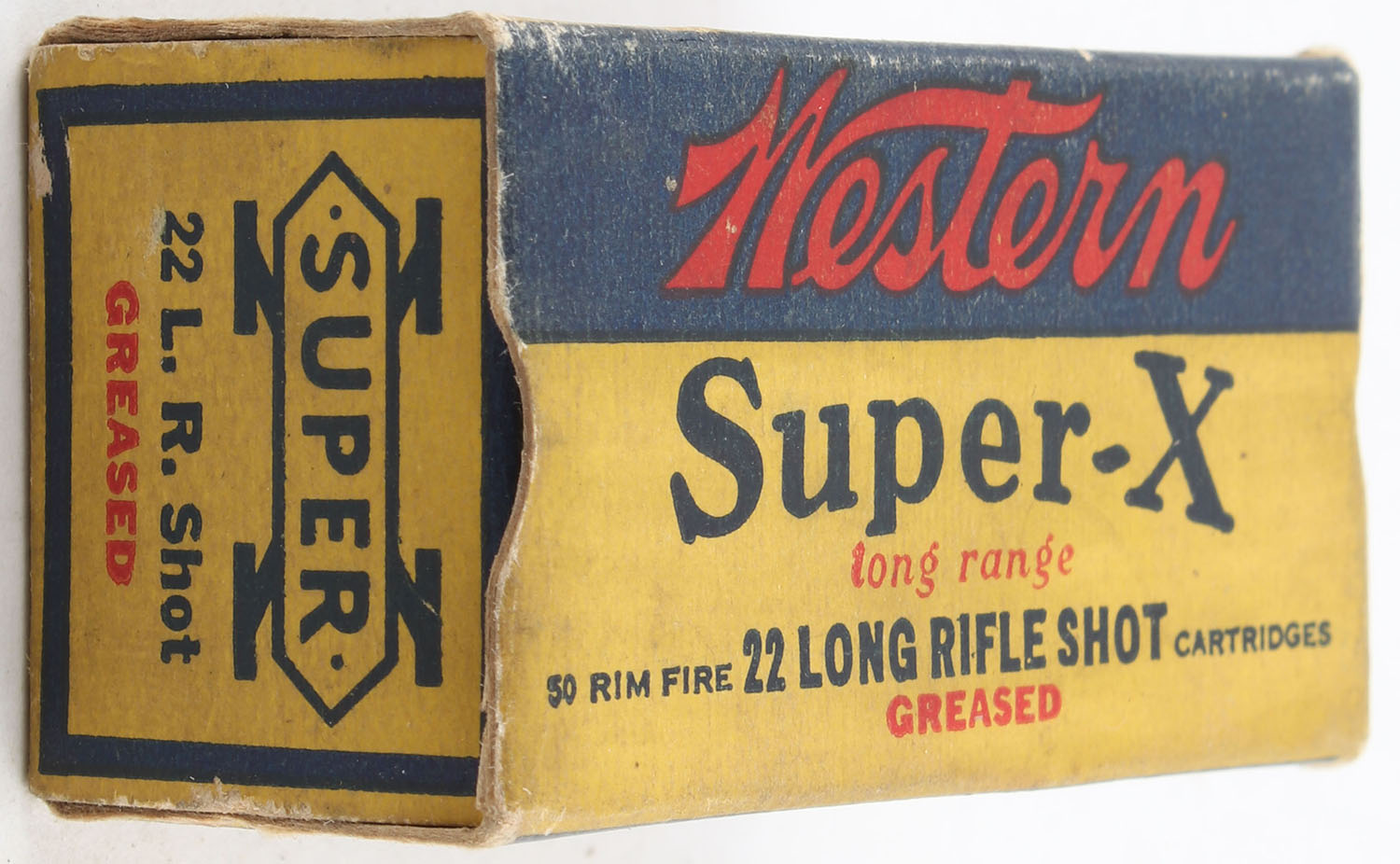 Western, Super-X, .22 Long Rifle Shot, Greased, RHWeb: WCC-Super-X-Long Rifle LRS-9, Partial 47rds., 1pc. Yellow blue & red box, box is solid with very good color, some age soiling, very minor corner wear, edges are crisp, end flaps are solid, ammo is excellent. Grade: Very Good ++ - Value: 40 to 60