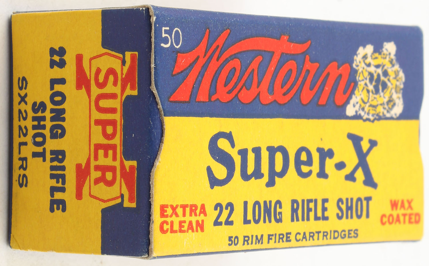 Western, Super-X, .22 Long Rifle Shot, RHWeb: WCC-Super-X-Long Rifle LRS-21, Full, 1pc. Yellow blue & red box, box is MINT with minty color, corners are sharp, edges are crisp, end flaps are solid, ammo is excellent. Grade: MINT - Value: 24 to 36