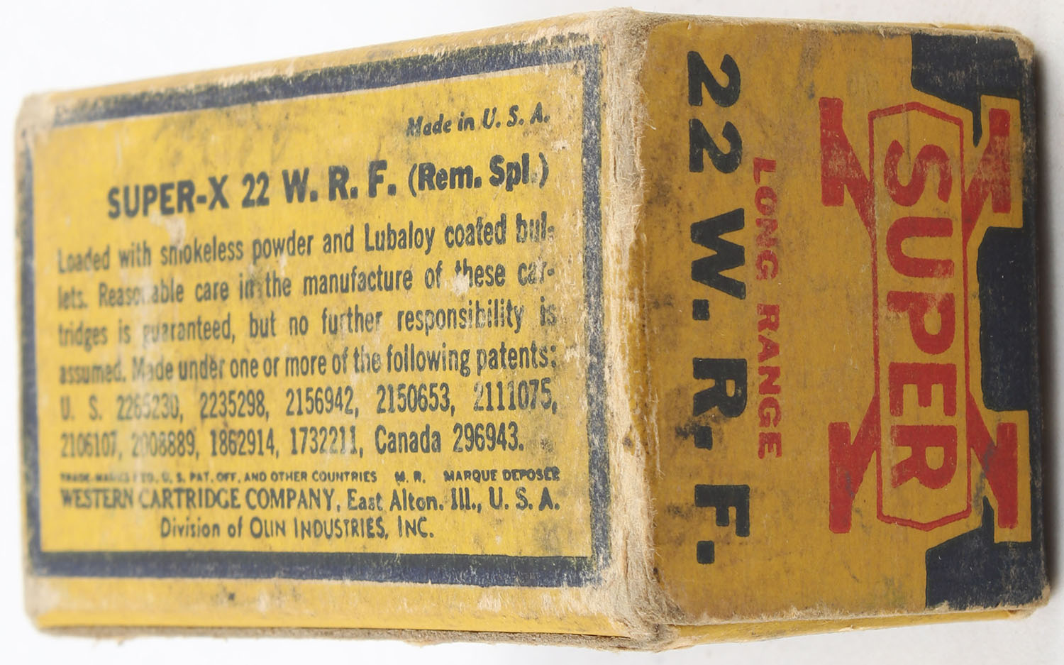 Western, Super-X, .22 W.R.F. (Rem. Spl.), RHWeb: WCC-Super-X-WRF WRF-13, Partial 47rds., 1pc. Yellow blue & red box, box is solid with good color, age soiling, some shelf wear, corner wear, minor edge wear, end flaps are solid, ammo is excellent. Grade: Very Good - Value: 16 to 24