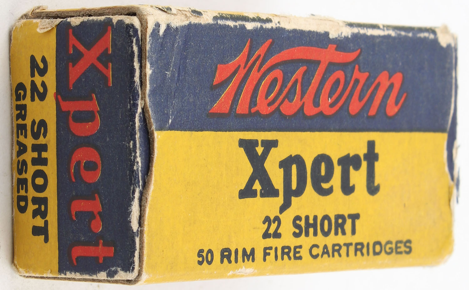 Western, Xpert, .22 Short, Greased, RHWeb: WCC-52 S-1d, Full, 1pc. Yellow blue & red box, box is solid with very good color, some age soiling, some edge & corner wear, right end flap is nearly torn off, left end flap is solid, ammo is very good. Grade: Good ++ - Value: 6 to 9