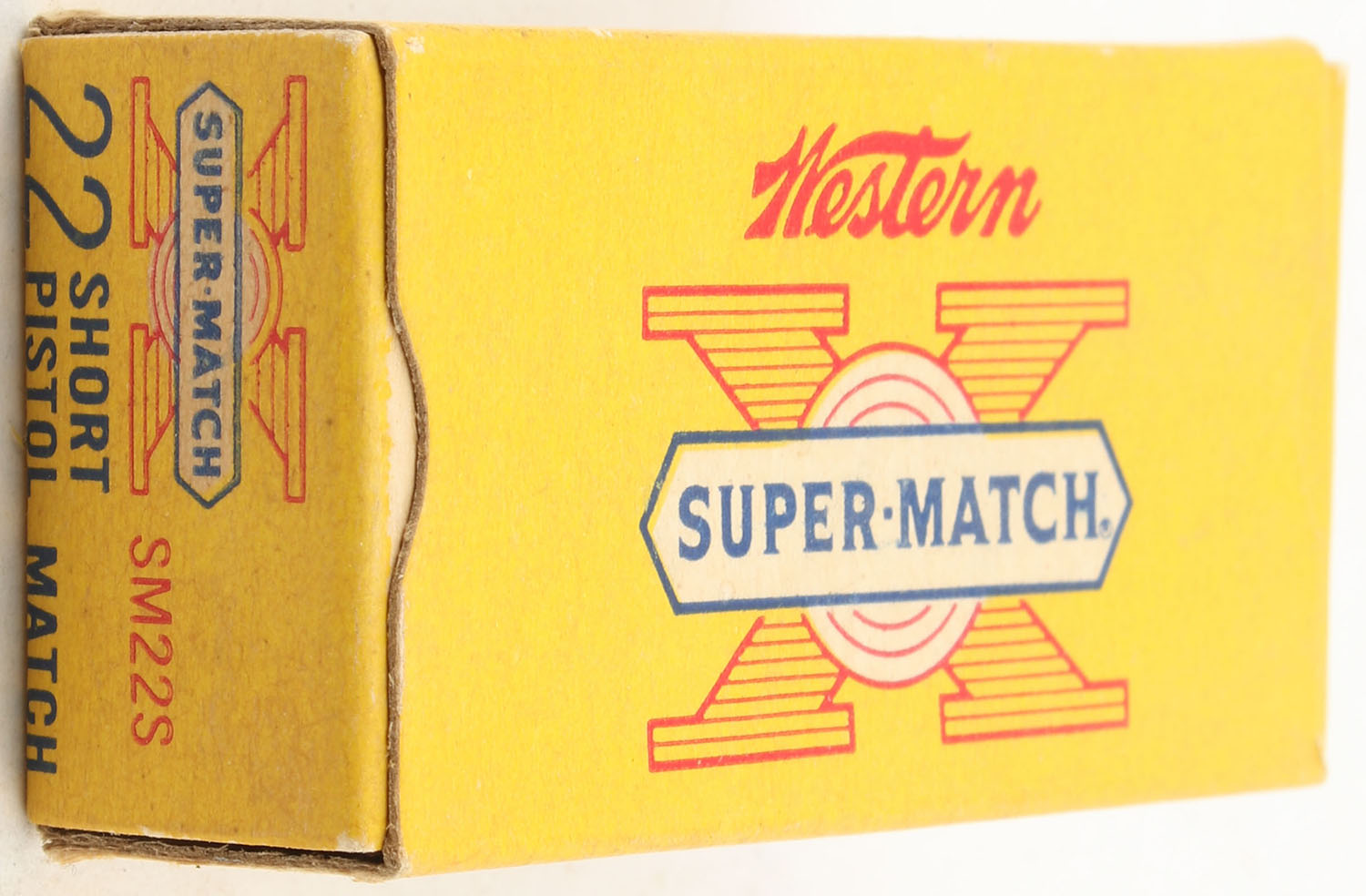 Western, Super-Match, .22 Short, Pistol Match, RHWeb: WCC-51.5, full, 1pc. Yellow white & red box, box is solid with very good to excellent color, minor age soiling, corners are mostly sharp, edges are crisp, end flaps are solid, ammo is excellent. Grade: Excellent - Value: 16 to 24