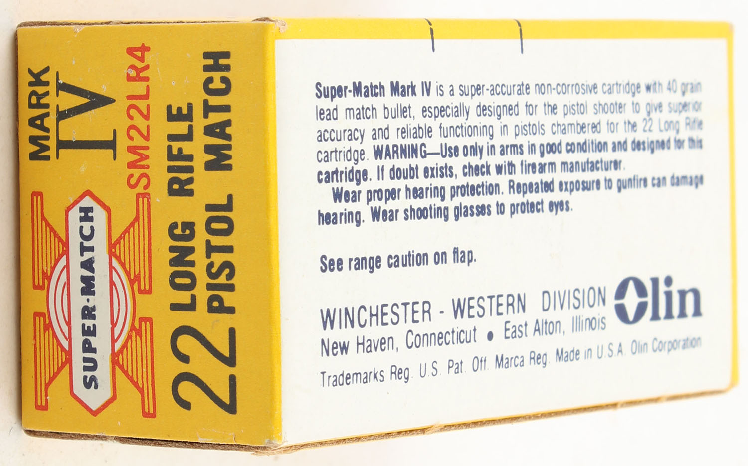 Western, Super-Match Mark IV, .22 Long Rifle, Pistol Match, RHWeb: WCC-51.4 LR-2e, Full, 1pc. Yellow red & white box, box is MINT with minty color, corners are sharp, edges are crisp, end flaps are solid, ammo is minty. Grade: MINT - Value: 10 to 15