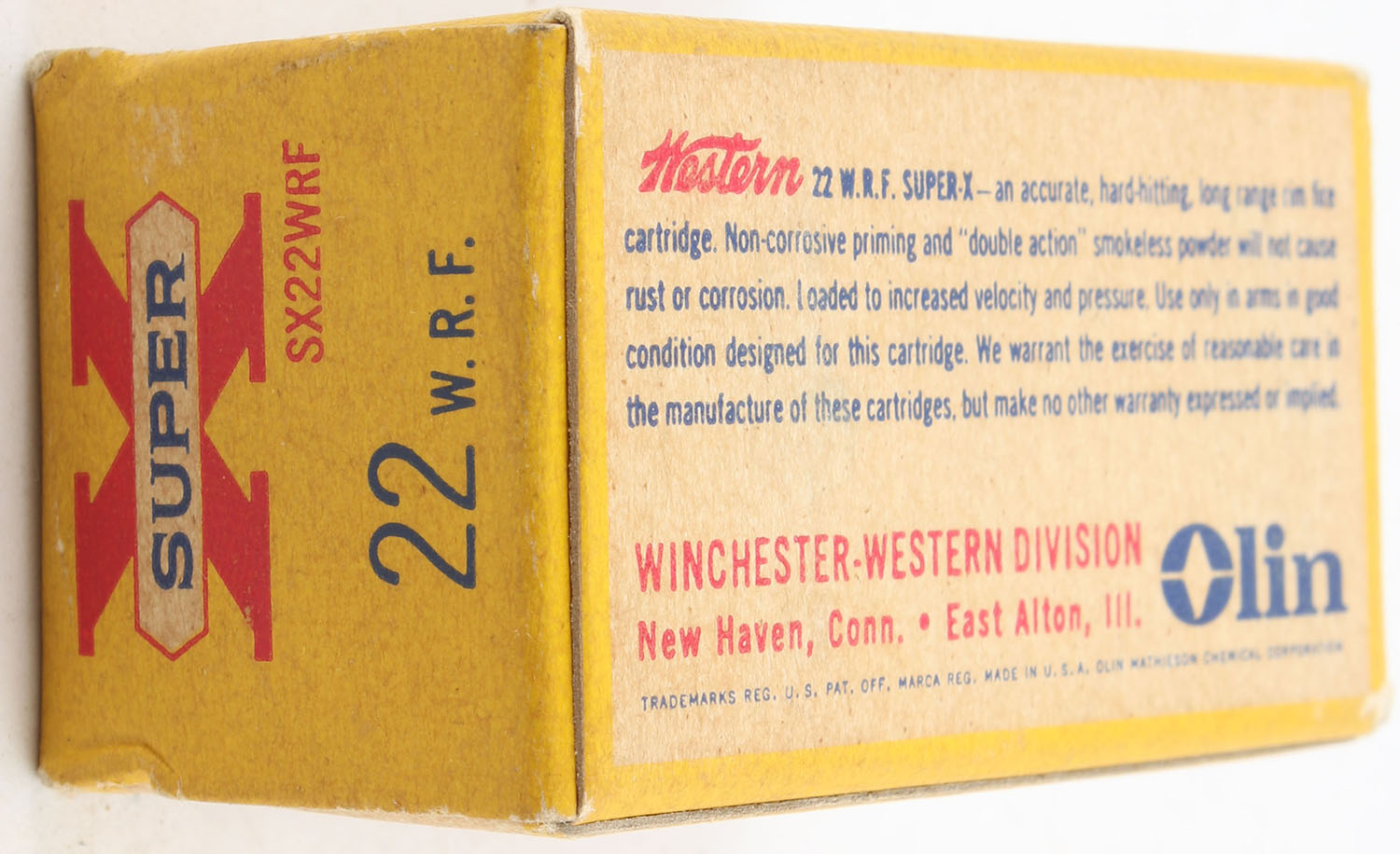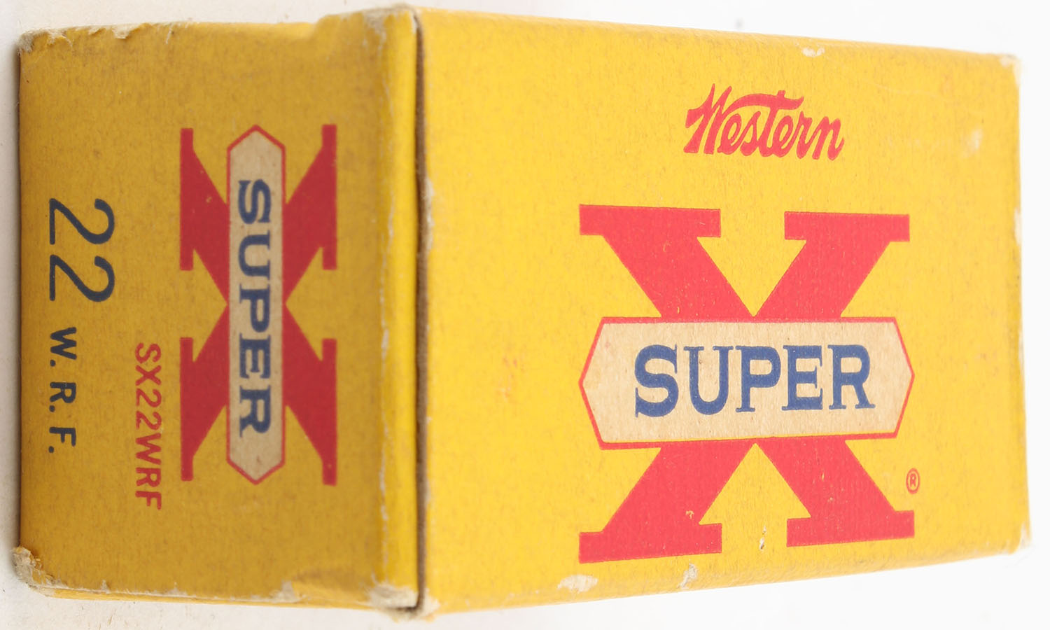 Western, Super X, .22 W.R.F., 45 Grain Lubaloy Coated Bullet, RHWeb: WCC-11 WRF-1b, Full, 1pc. Yellow red & white box, box is solid with very good to excellent color, minor age soiling & corner wear, very minor edge wear, end flaps are solid, ammo is excellent to minty. Grade: Excellent - Value: 20 to 30