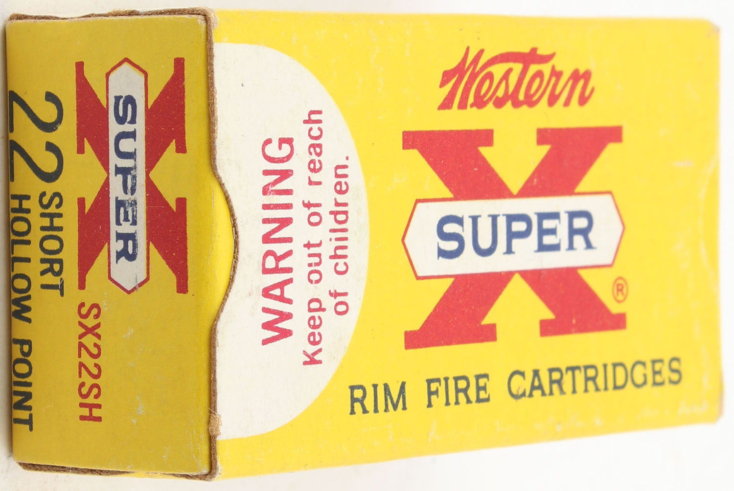 Western, Super X, .22 Short Hollow Point, 27 Grain Lubaloy Coated Bullet, Full, 1pc. Yellow red & white box, box is solid with minty color, very minor corner wear, edges are crisp, end flaps are solid, ammo is excellent. Grade: Excellent + - Value: 8 to 16