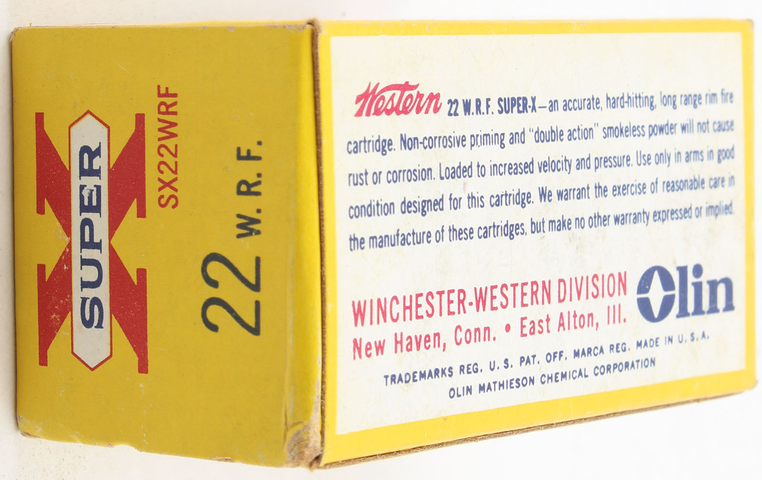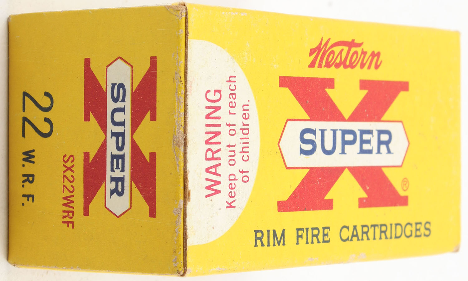 Western, Super X, .22 W.R.F., 45 Grain Lubaloy Coated Bullet, RHWeb: WCC-12 WRF-1b, Full, 1pc. Yellow red & white box, box is solid with excellent color, very minor edge & corner wear, end flaps are solid, ammo is excellent. Grade: Excellent + - Value: 12 to 18