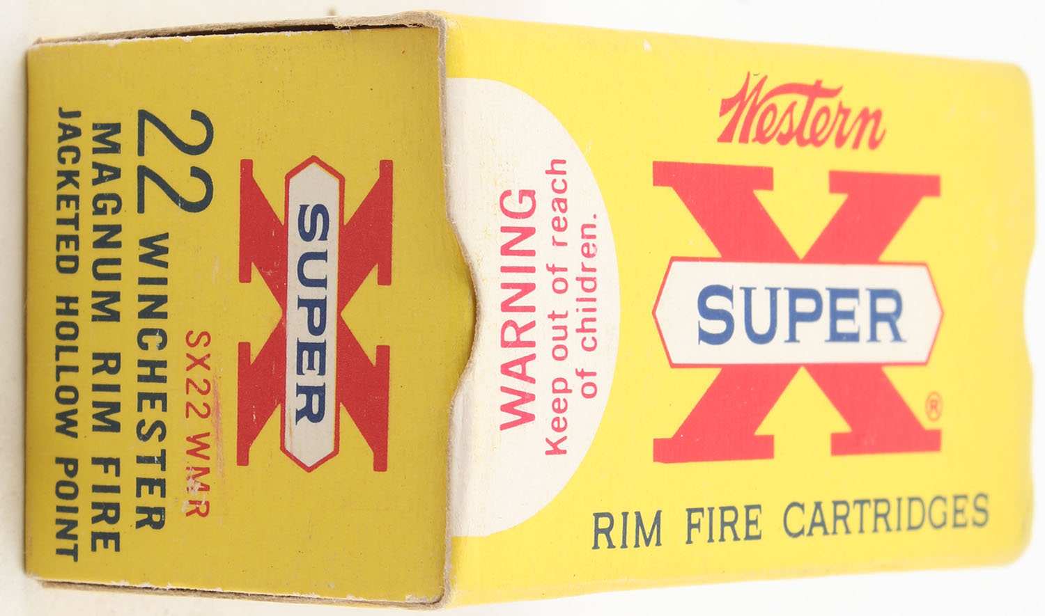 Western, Super-X, .22 Winchester Magnum, 40 Grain Jacketed Hollow Point, RHWeb: WCC-12 WMR-1a, Full, 1pc. Yellow red & white box, box is solid with minty color, minor corner wear, edges are crisp, end flaps are solid, ammo is excellent. Grade: Excellent + - Value: 10 to 15