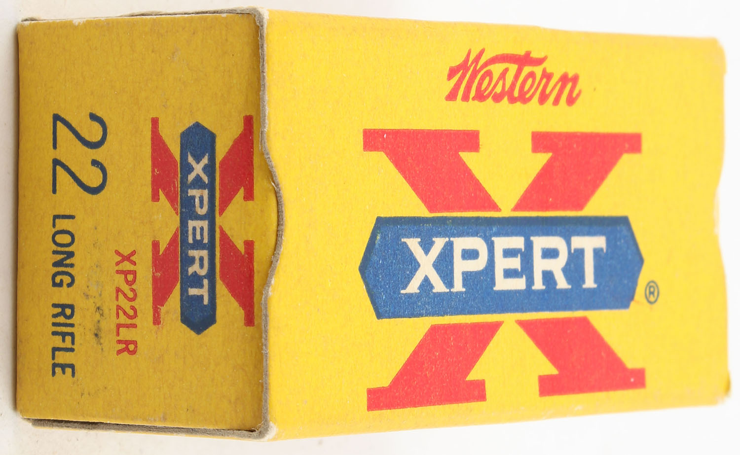 Western, Xpert, .22 Long Rifle, RHWeb: WCC-52 LR-2a, Full, 1pc. Yellow red & blue box, box is solid with excellent color, very minor corner wear, edges are mostly crisp, end flaps are solid, ammo is excellent. Grade: Excellent + - Value: 10 to 15