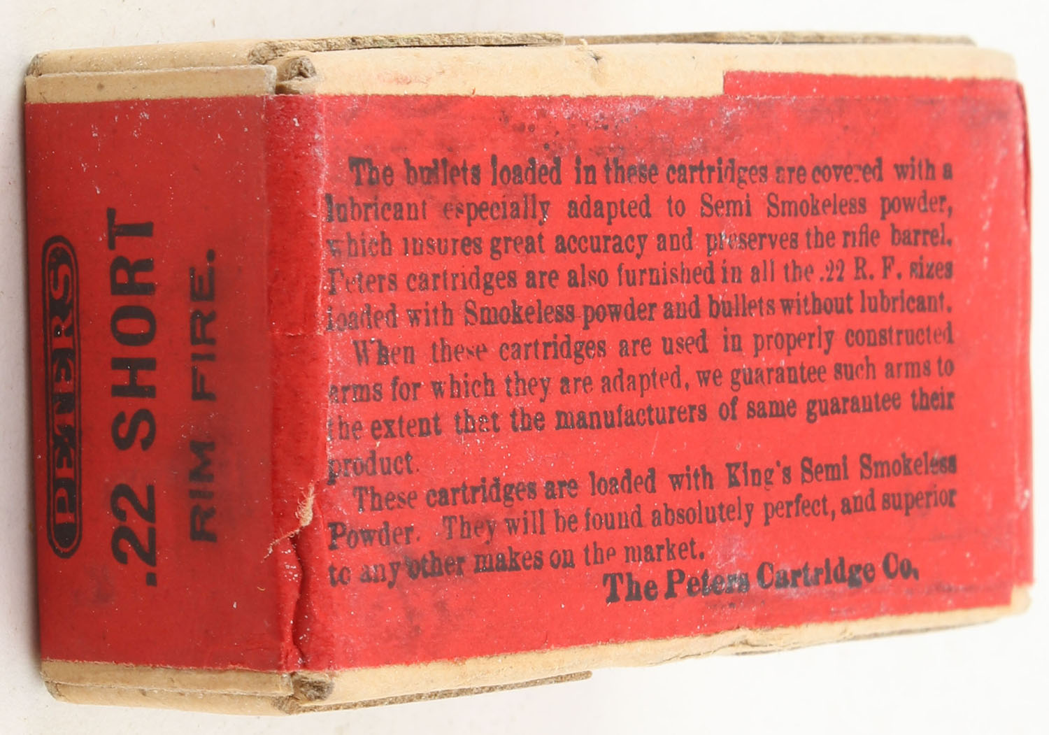 Peters, Rim Fire Rifle Cartridges, .22 Short, Semi-Smokeless Powder, RHWeb: PCC-4 S-2, FULL & SEALED, 2pc. Buff box with red wraparound label, box is MINT with minty color, corners are sharp, edges are crisp, label is intact. Grade: MINT - Value: 120 to 180
