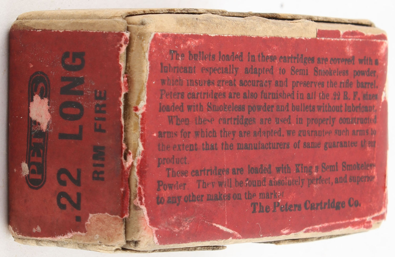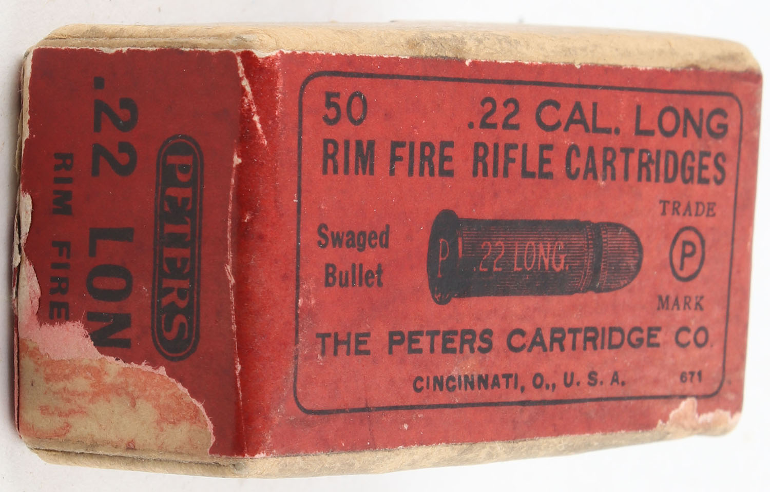 Peters, Rim Fire Rifle Cartridges, .22 Long, Swaged Bullet, RHWeb: PCC-4 L-1c, Full, 1pc. Buff box with red wraparound label, box is solid with very good color, some age soiling, minor edge & corner wear, label is 99% intact, ammo is fair. Grade: Very Good - Value: 20 to 30
