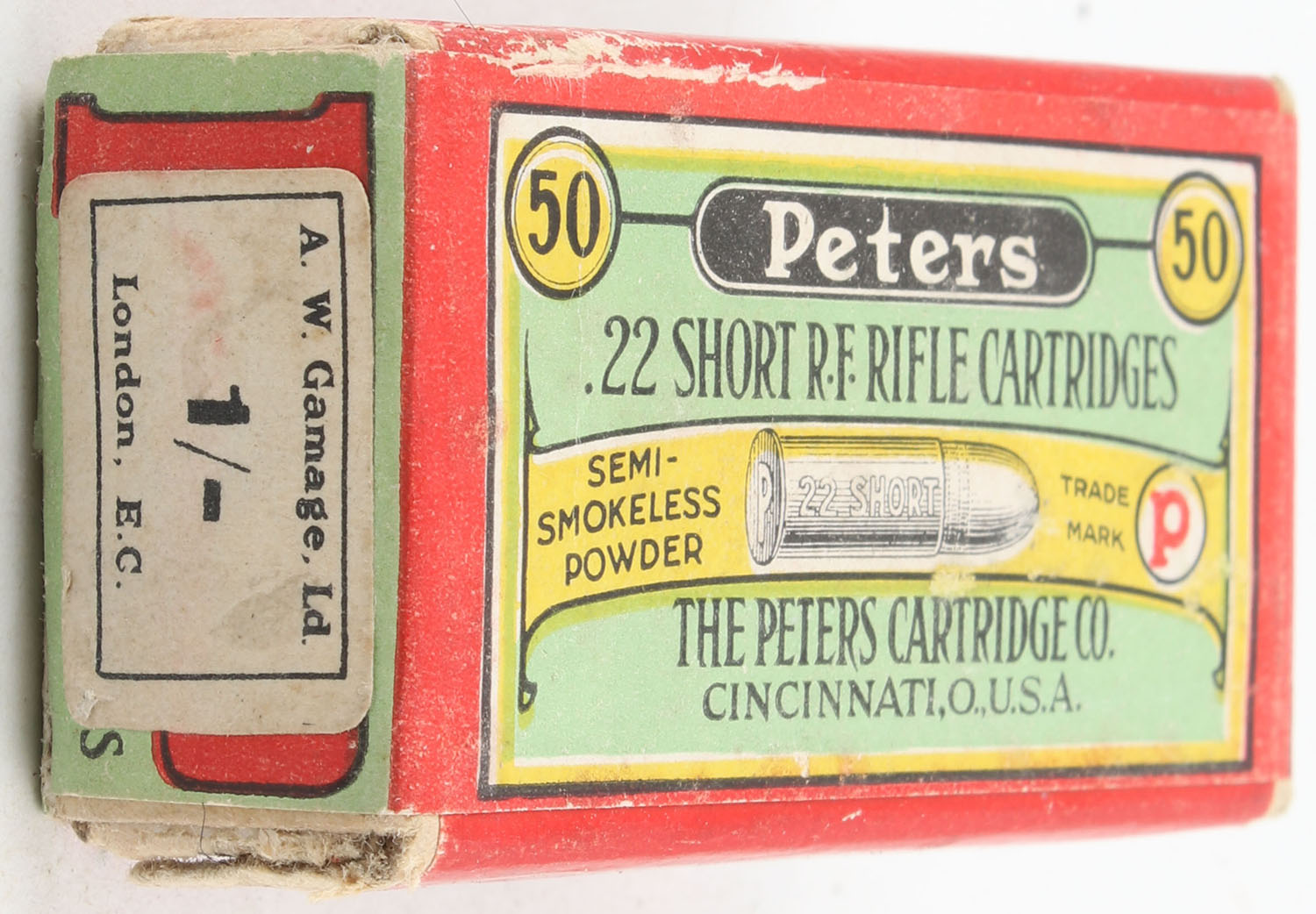 Peters, R.F. Rifle Cartridges, .22 Short, Semi-Smokeless Powder, RHWeb: PCC-5A S-1a, Full, 2pc. Buff box with green red & yellow full wraparound label, Gamage price tag on right end, vertical seam spit to front left corner of lid, excellent color, corners otherwise mostly sharp, edges are crisp, label is intact, ammo is fair. Grade: Very Good ++ - Value: 50 to 75