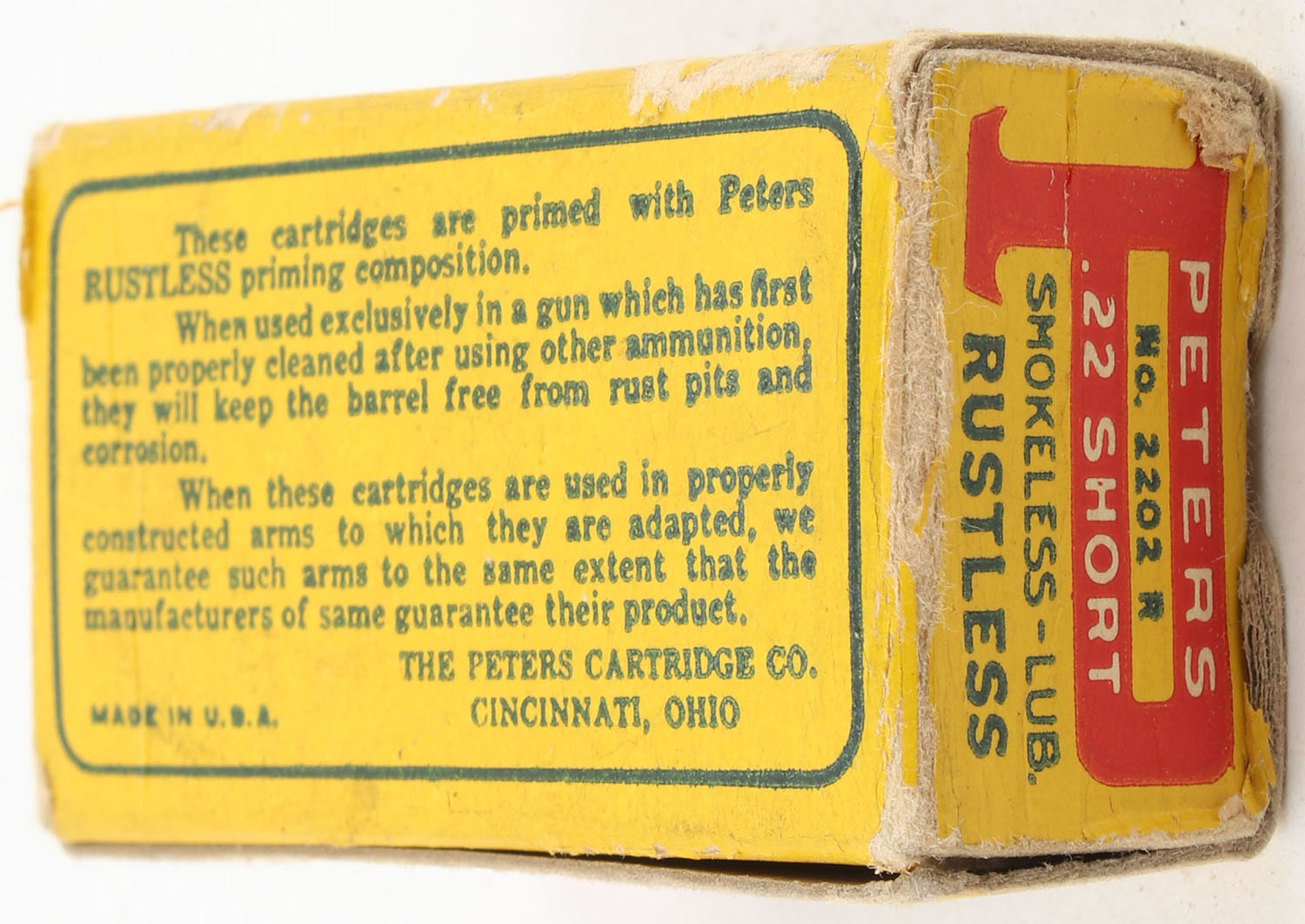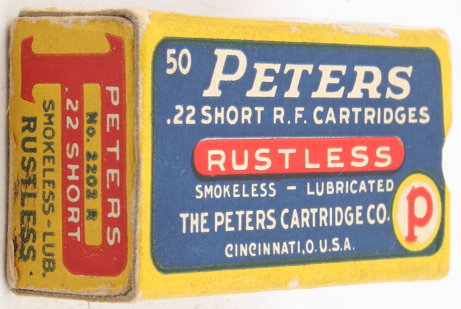 Peters, Rustless, .22 Short, Smokeless - Lubricated, RHWeb: PCC-8A S-4b, Partial 36rds. Of mixed (but mostly correct) ammo, 1pc. Blue yellow & red box, box is solid with excellent to minty color, some corner wear, edges are mostly crisp, scuff on back side, end flaps are solid, ammo is excellent. Grade: Excellent + - Value: 16 to 24