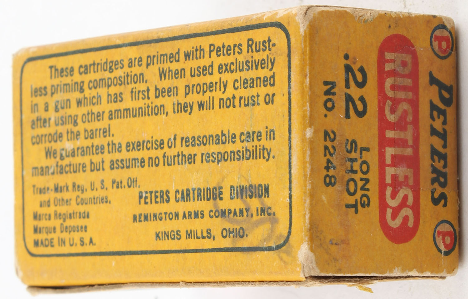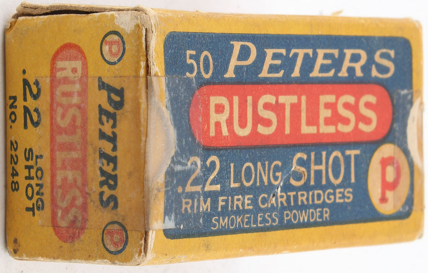 Peters, Rustless, .22 Long Shot, RHWeb: PCC-8C L-2, Partial 21rds. 1pc. Blue yellow & red box, box is solid with very good color, some age soiling, tape on both end flaps, minor corner wear, very minor edge wear, end flaps are solid, ammo is excellent. Grade: Very Good + - Value: 16 to 24