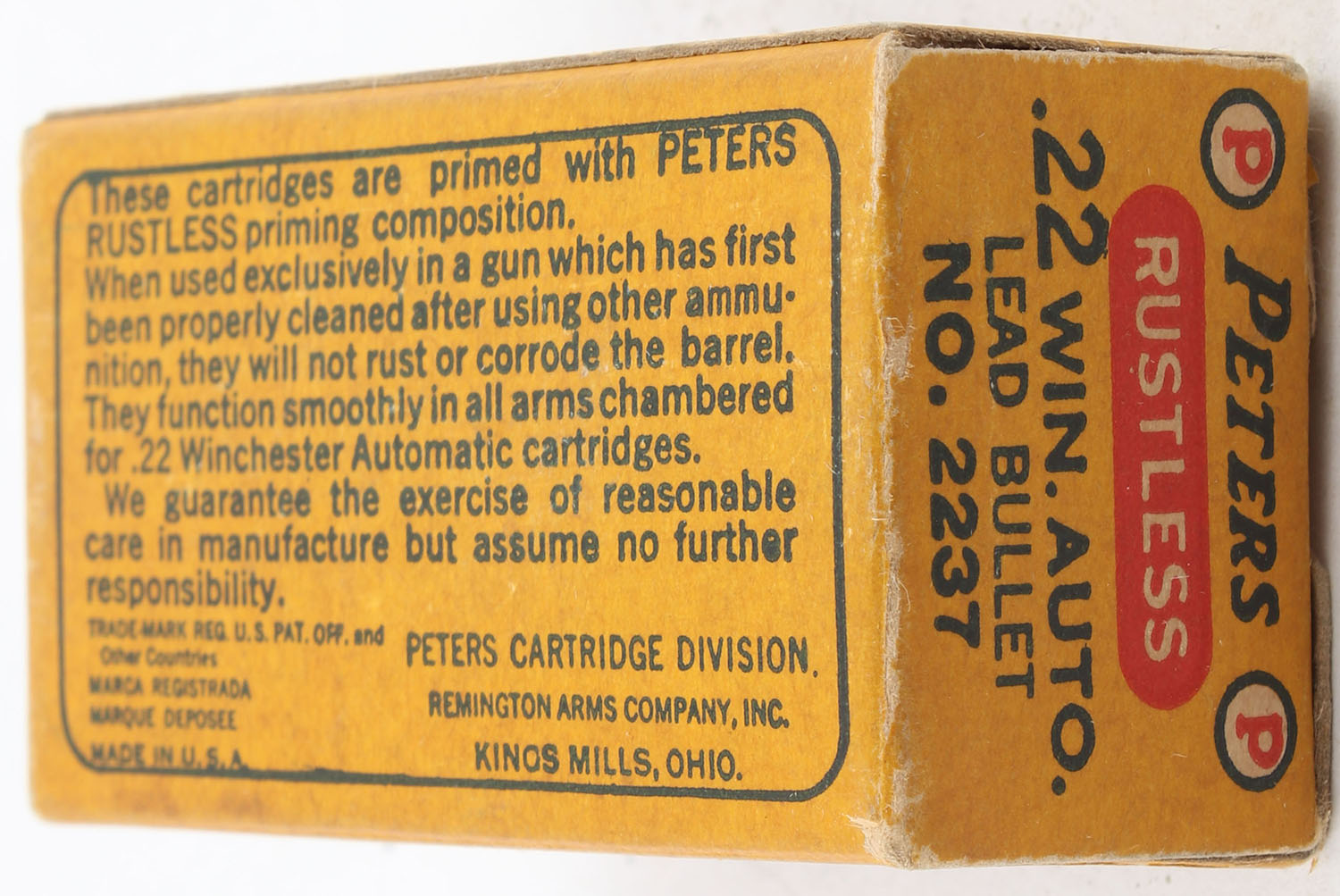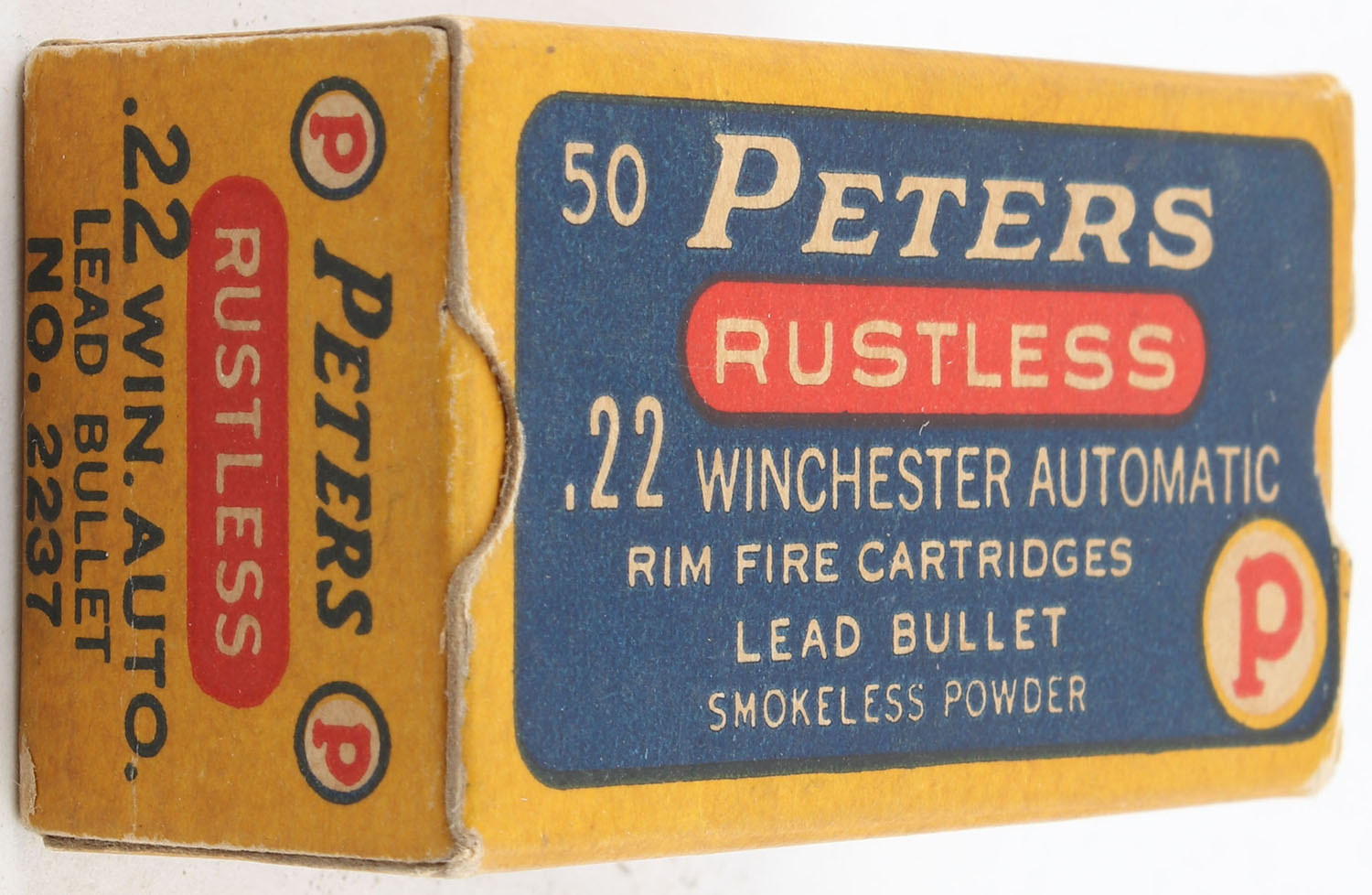 Peters, Rustless, .22 Winchester Automatic, RHWeb: PCC-8C WA-3.1a, Partial 36rds., 1pc. Blue yellow & red box, box is solid with very good color, some age soiling & corner wear, edges are mostly crisp, end flaps are solid, ammo is excellent. Grade: Very Good + - Value: 16 to 24