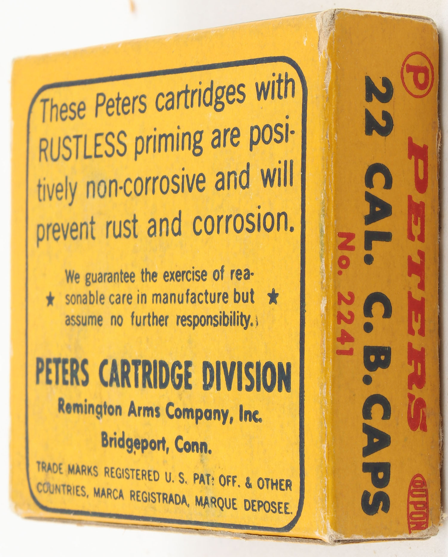 Peters, Rustless, .22 C.B. Caps, RHWeb: PCC-8D CB-1b, Partial approx 75rds. 1pc. Blue yellow & red box, box is solid with very good color, some age soiling, minor edge & corner wear, end flaps are solid, ammo is excellent. Grade: Very Good + - Value: 24 to 36