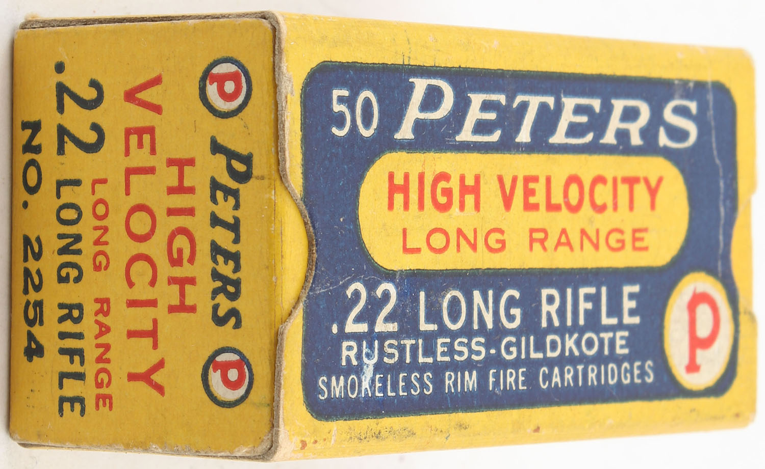 Peters, High Velocity Long Range, .22 Long Rifle, RHWeb: PCC-11A LR-1a, Partial 20rds., 1pc. Blue yellow & red box, box is solid with excellent color, very minor age soiling, small crease on top, very minor corner wear, edges are mostly crisp, end flaps are solid, ammo is excellent. Grade: Excellent - Value: 20 to 30