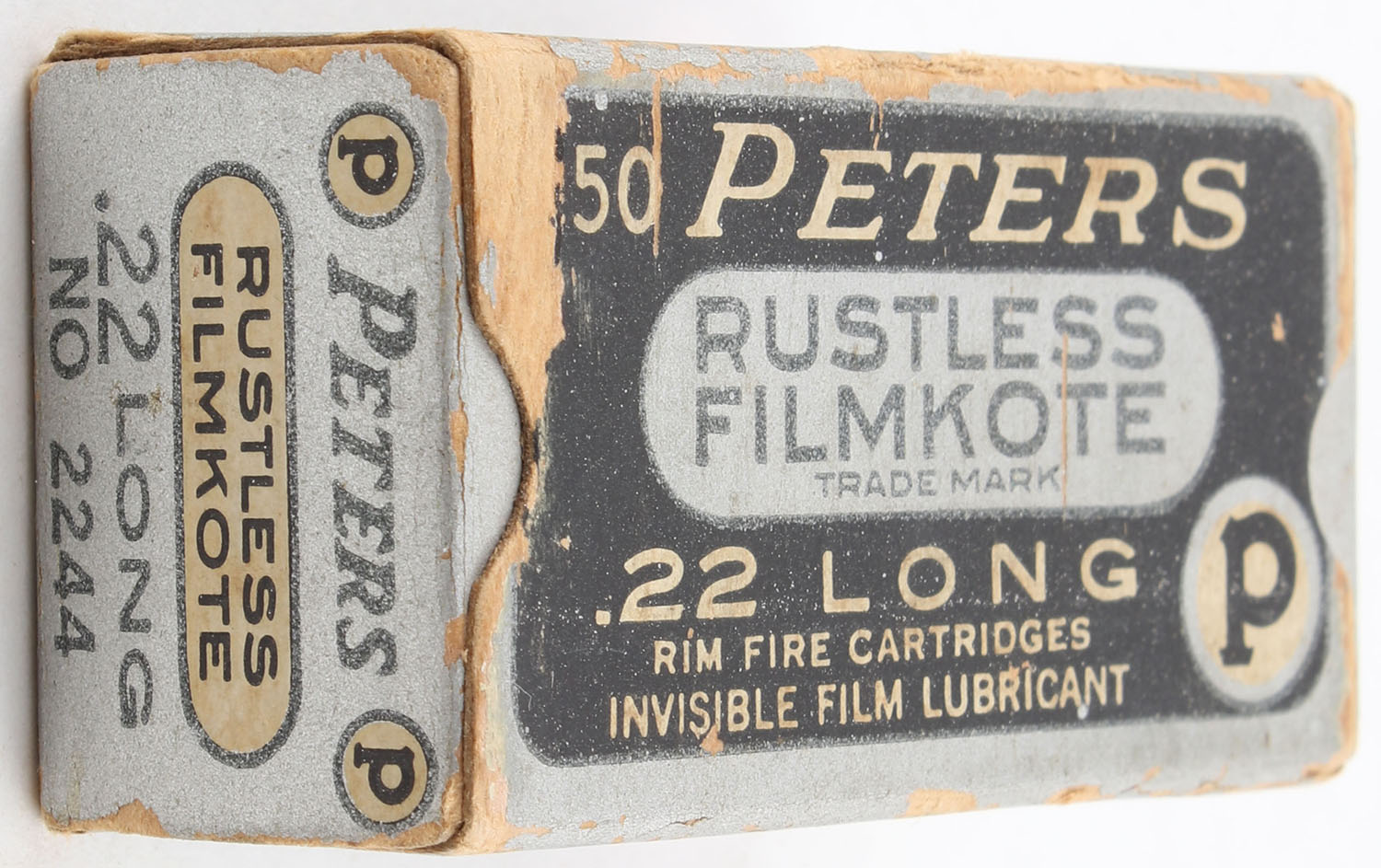 Peters, Rustless Filmkote, .22 Long RHWeb: PCC-12 L-1c, Full, 1pc. Black & silver box, box is solid with good to very good color, minor age soiling & shelf wear, some scuffing, some edge & corner wear, end flaps are solid, ammo is excellent. Grade: Very Good - Value: 40 to 60